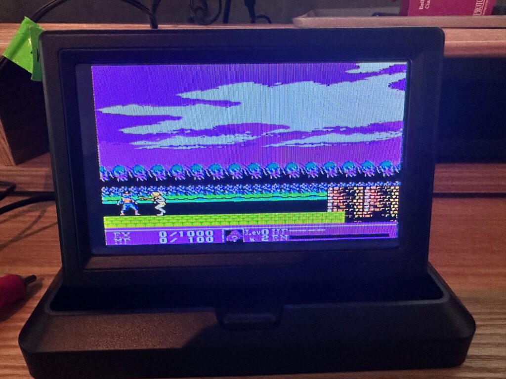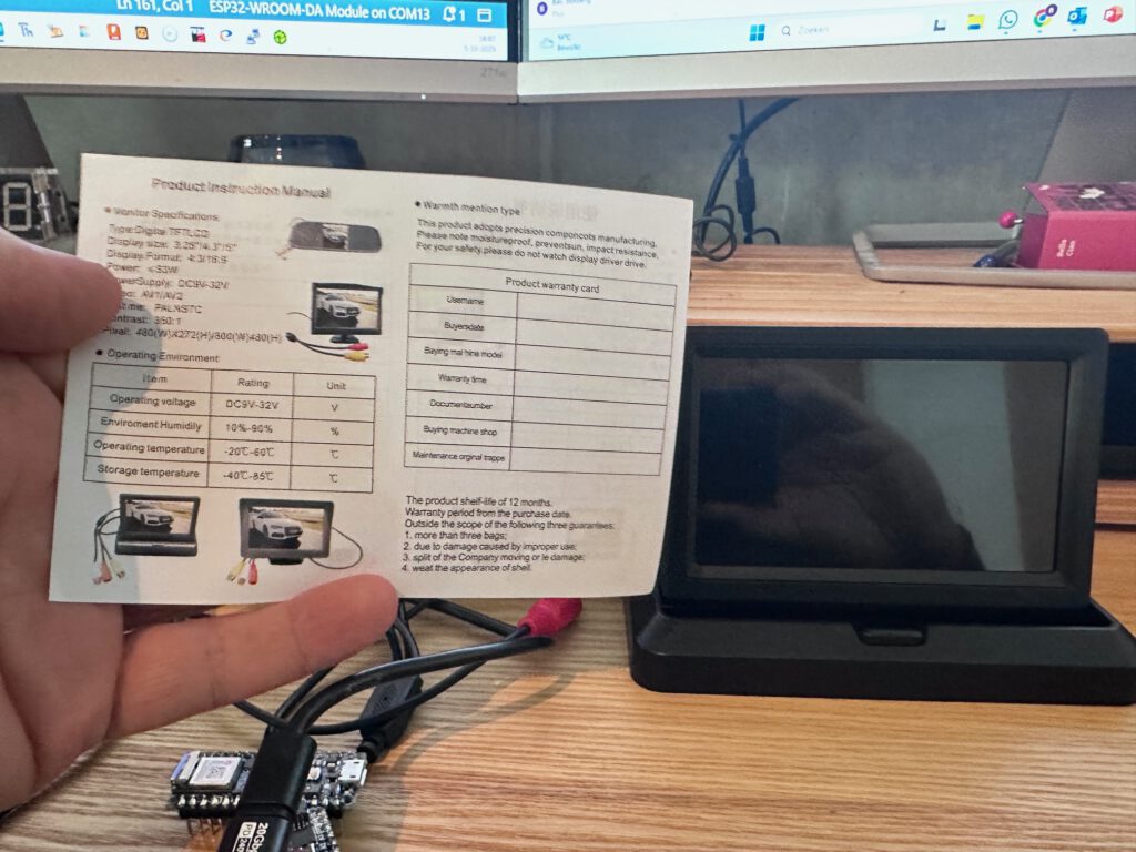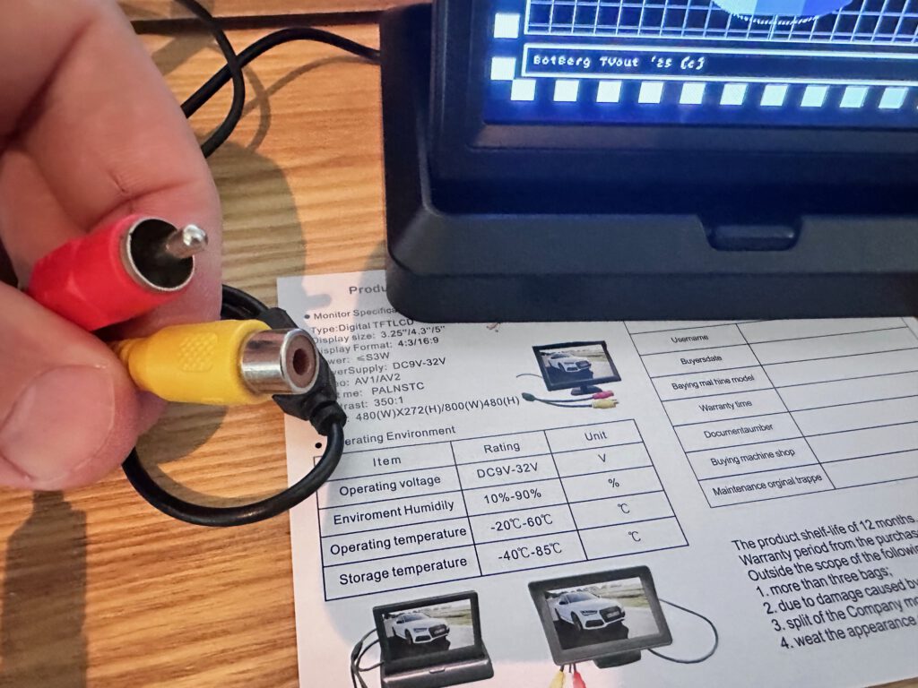 Voor de weergave gebruik ik een achteruitrijcamera-monitor: een digitale TFT-LCD van 3,25 inch met een resolutie van 480×272, geschikt voor PAL en NTSC. De monitor is compact, klapt eenvoudig uit, en heeft twee composiet ingangen; standaard toont deze de ingang die het laatst een geldig signaal leverde. Dat maakt testen op de werkvloer praktisch en snel. Om de mogelijkheden van de monitor te controleren, sluit ik een mobiele spelletjes-console aan, welke standaard een composite video signaal genereert. Dit signaal is gelijk aan de CCTV standaard en ik kan deze daarmee prima als benchmark inzetten.