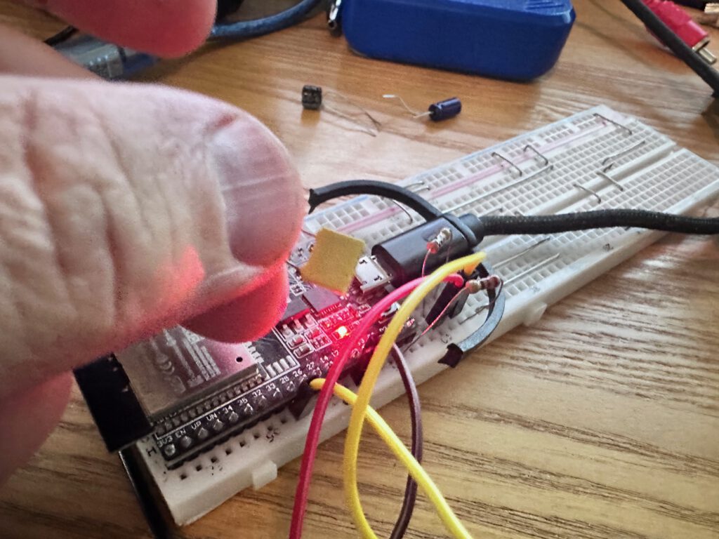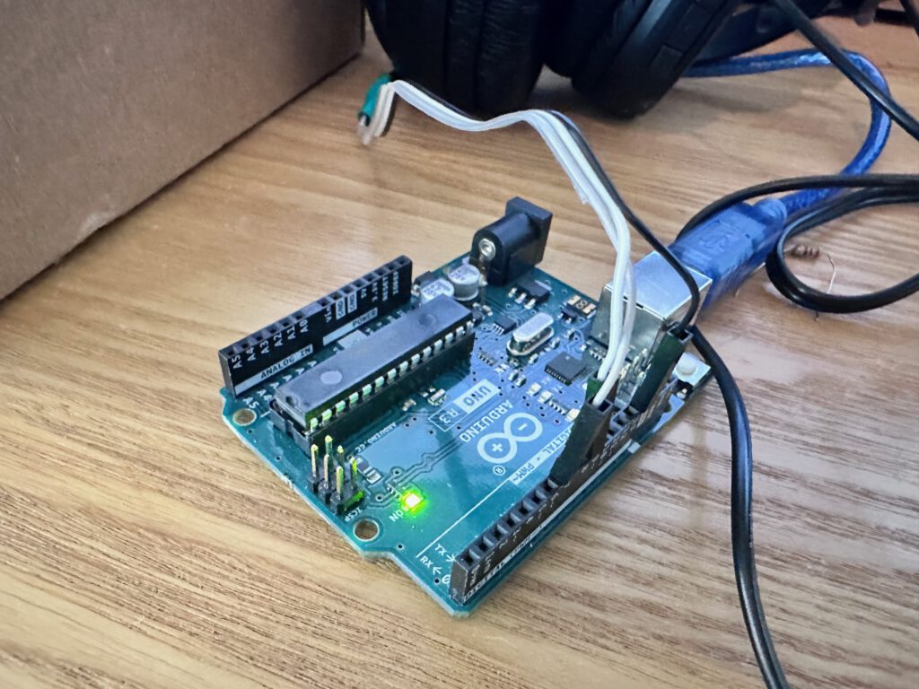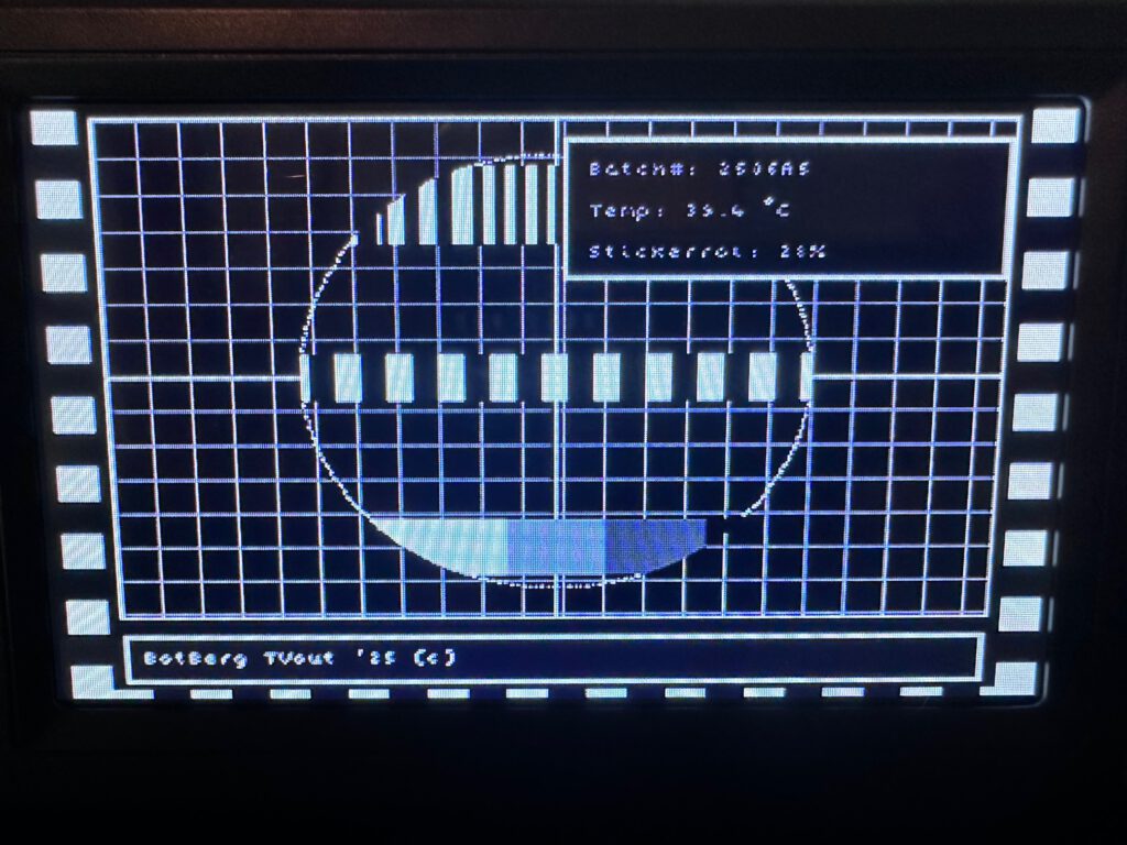 De eerste stap is de Arduino Uno met de TVout-bibliotheek (Avamander-fork). Met twee GPIO’s, voorzien van weerstanden (D7 via 470 ohm voor sync/blanking en D9 via 1 kilo-ohm voor video/pixels) is een primitief beeld te genereren. Door de 2 kilobyte SRAM-limiet van de Arduino Uno is de praktisch haalbare resolutie circa 136×96 pixels; voor deze toepassing is dat te beperkt.