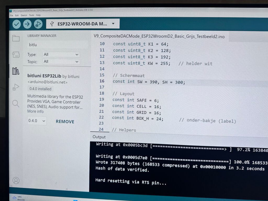 Voor hogere resolutie kies ik de ESP32 met de BitLuni-bibliotheek, die zowel composiet video als VGA kan genereren. Hiermee kan ik de variabelen in realtime renderen en als overlay opnemen in het samengestelde beeld. De bibliotheek neemt de kritische timing uit handen en levert goed leesbare fonts voor de gewenste videoresolutie.