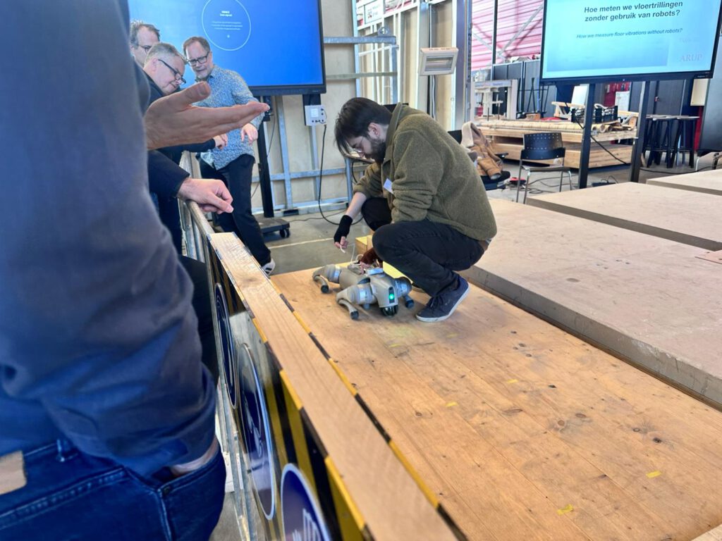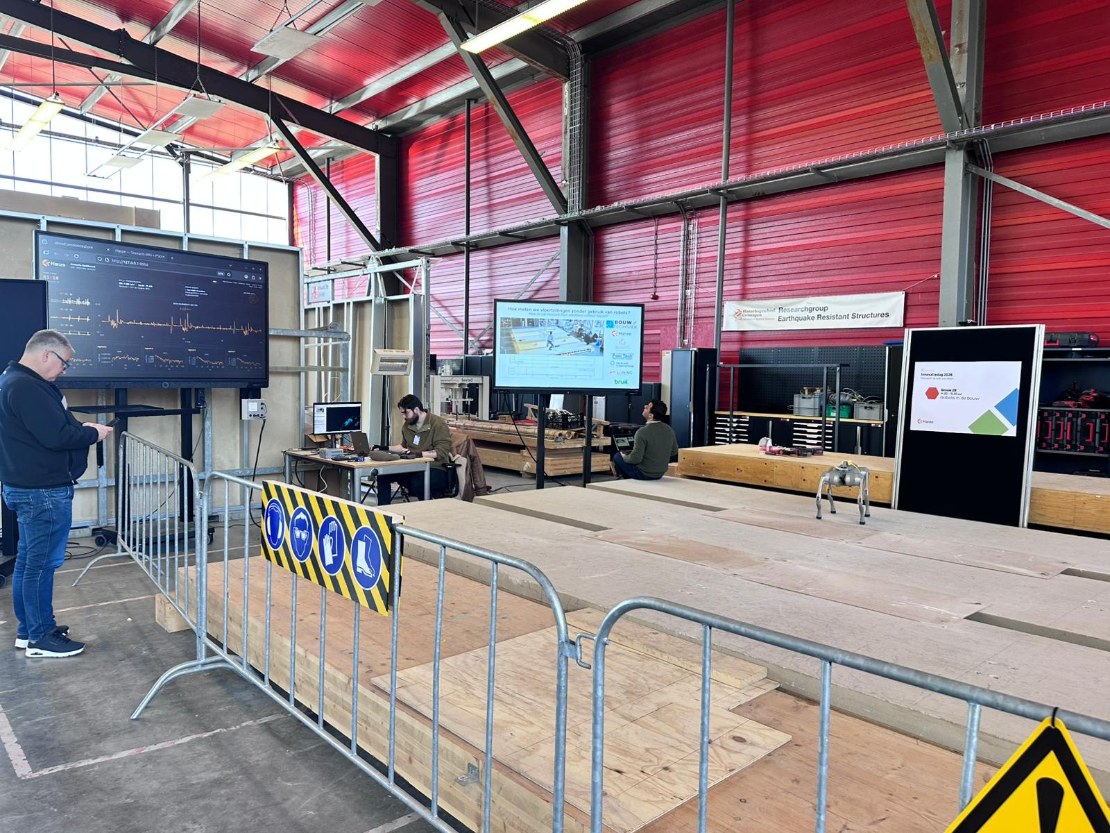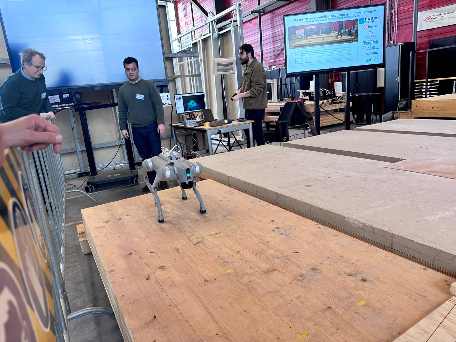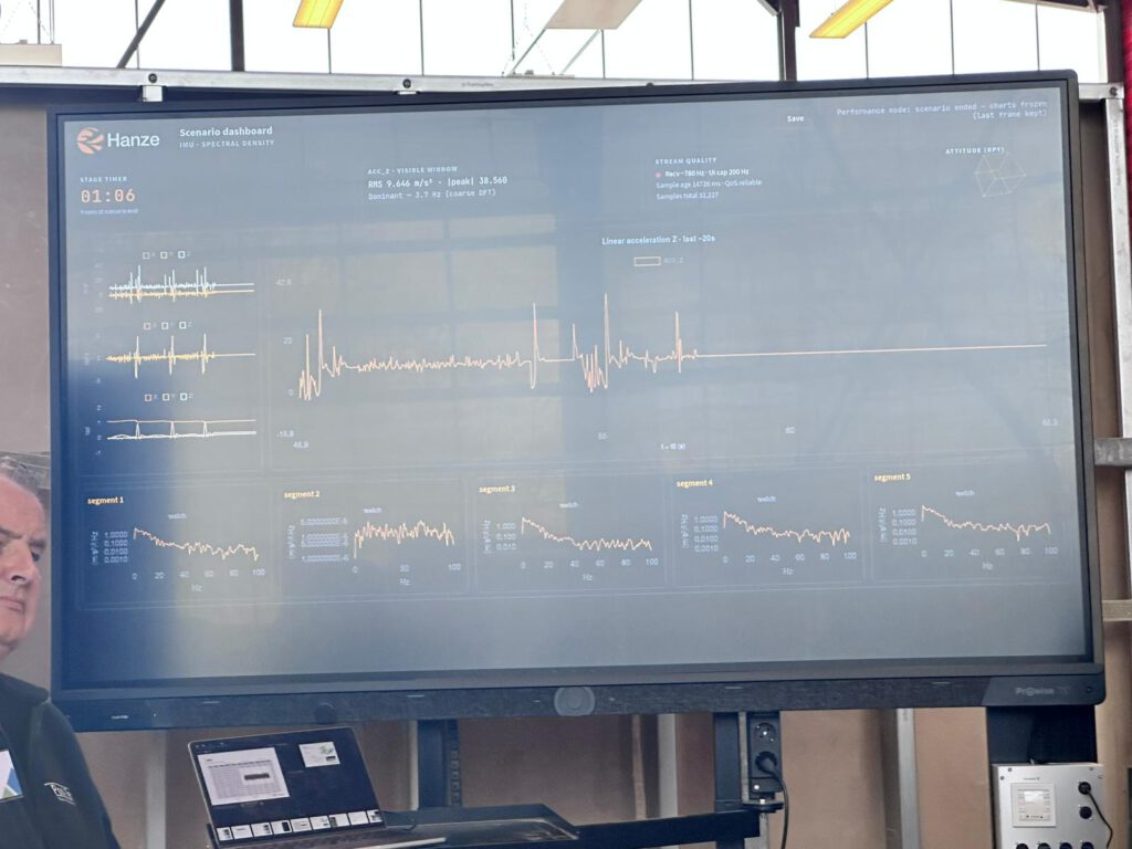 In Groningen presenteert de Hanzehogeschool MANCS — ook een Unitree Go2, net als Kai. De robot loopt over een testopstelling van houten vloerplanken met niveauverschillen. De IMU-trillingssensor meet vloervibraties terwijl de robot loopt — zichtbaar op een live Hanze scenario-dashboard.