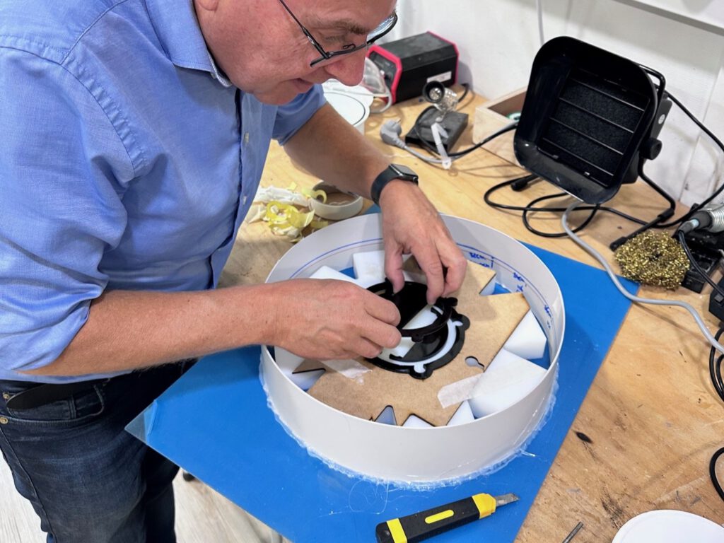Bij de tweede mal moet ik een uitsparing aanbrengen voor een spanningsregelaar en lichtslang. Deze onderdelen snij ik uit acrylaat met de lasersnijder en voorzie ik van dubbelzijdige tape. Met behulp van een bracket, die de vorm van de mal volgt en een pasvorm heeft voor de uitsparing, positioneer ik het onderdeel nauwkeurig. Daarna druk ik het op de juiste plek in de mal.