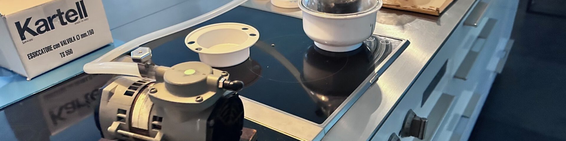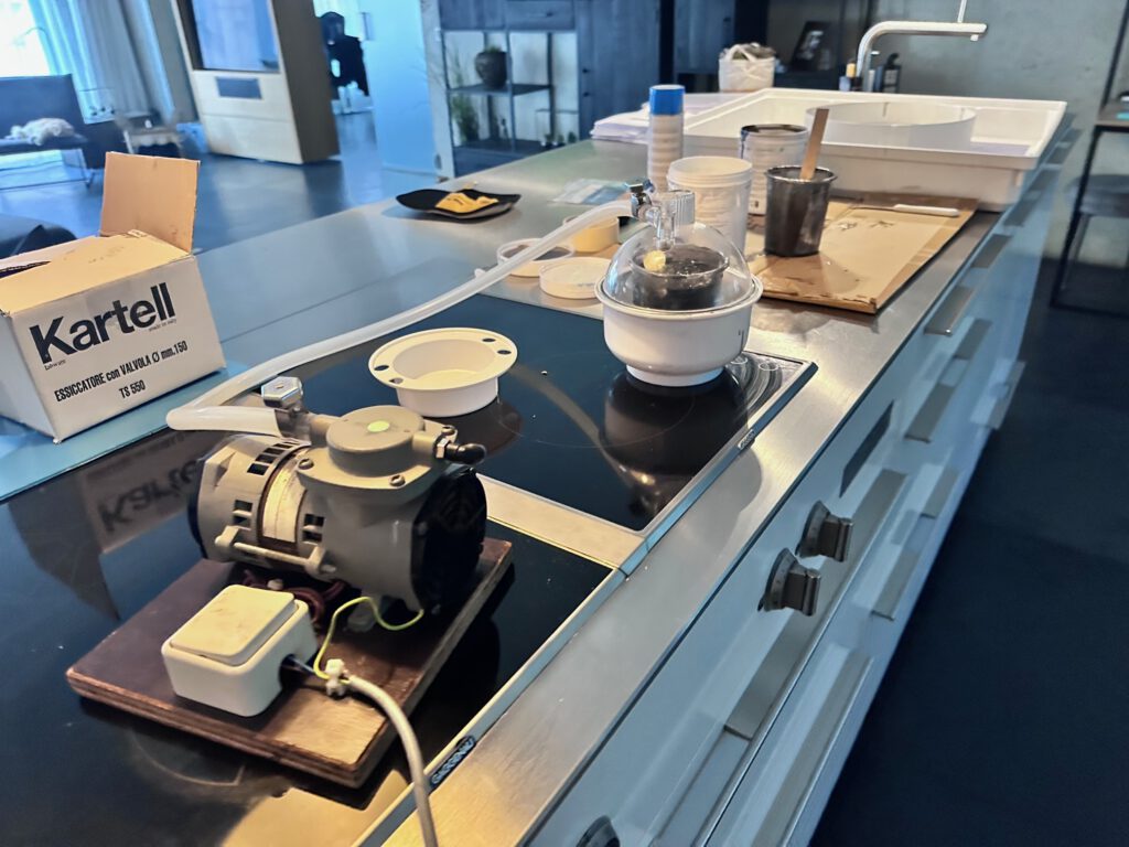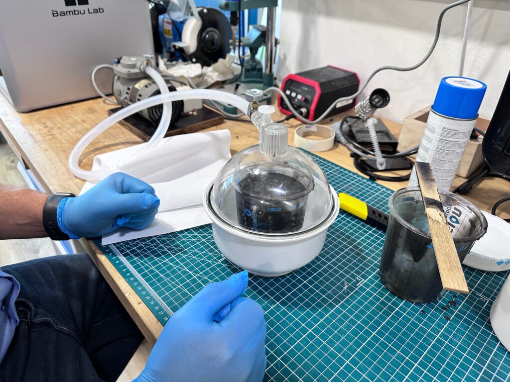 Ik gebruik Resium siliconen gietrubber 1:1 Shore 40, waarmee ik eerder al goede resultaten behaalde. Het materiaal bestaat uit twee componenten: basis (A) en verharder (B). Ik weeg beide componenten in gelijke verhouding af en meng ze zorgvuldig gedurende drie minuten, zonder te intensief te roeren. Ik zorg dat ook bodem en zijkanten meegenomen worden en giet het mengsel daarna over in een nieuwe beker. Deze meng ik opnieuw en plaats ik in een vacuümkoepel van 2,15 liter inhoud. Binnen drie minuten zijn vrijwel alle luchtbellen verdwenen en is het mengsel ontgast.