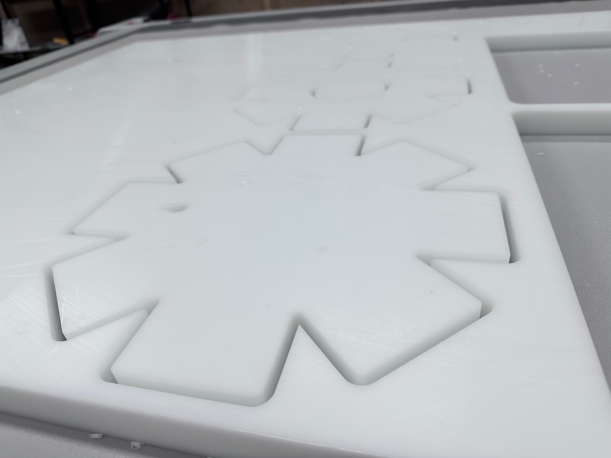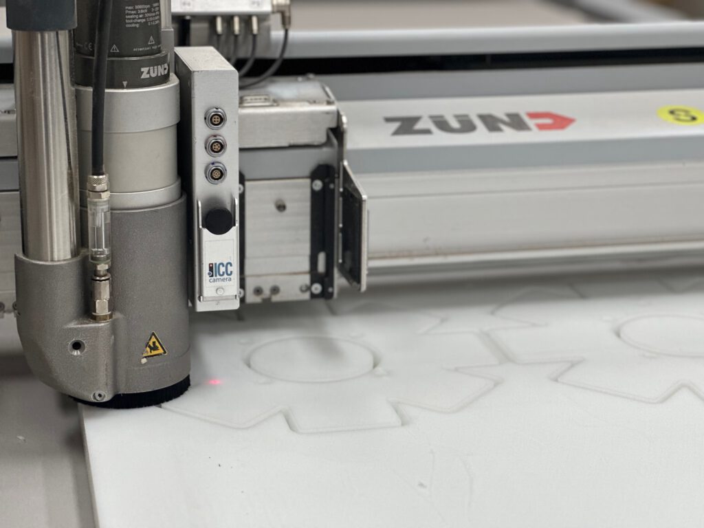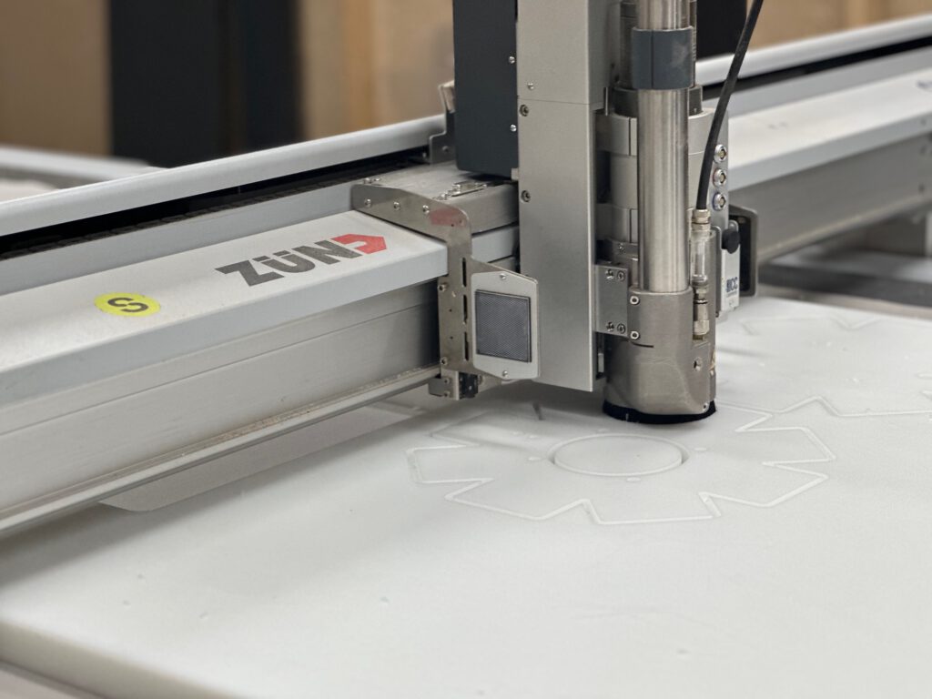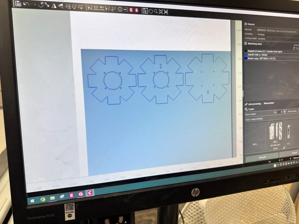 Ik ga terug naar VCarve om een DXF-pad te maken van de drie verschillende mallen. Alle gaten moeten door en door gefreesd worden. Als materiaal gebruik ik POM (PolyOxyMethylene, ook bekend als Delrin): een sterke, stijve en slijtvaste kunststof met hoge maatvastheid, veel gebruikt in precisie-onderdelen zoals tandwielen, lagers en scharnieren. Het is food-safe en hecht nauwelijks aan siliconenrubber vanwege de lage oppervlakte-energie. Voor de zekerheid breng ik een dun laagje lossingsspray aan, zodat eventuele vastzuiging op platte vlakken wordt voorkomen. Het POM leg ik op de Zünd freesmachine. Het vacuümbed houdt de plaat stevig vast. De frees snijdt door het hele materiaal heen, waardoor de 30 mm plaat niet gedraaid hoeft te worden. Dit geeft een strakke freeslijn, wat ten goede komt aan het gietresultaat. Kort daarna zijn de drie gefreesde masters klaar. Met een ontbraammes verwijder ik de laatste vezeltjes en breng ik opnieuw lossingsspray aan.