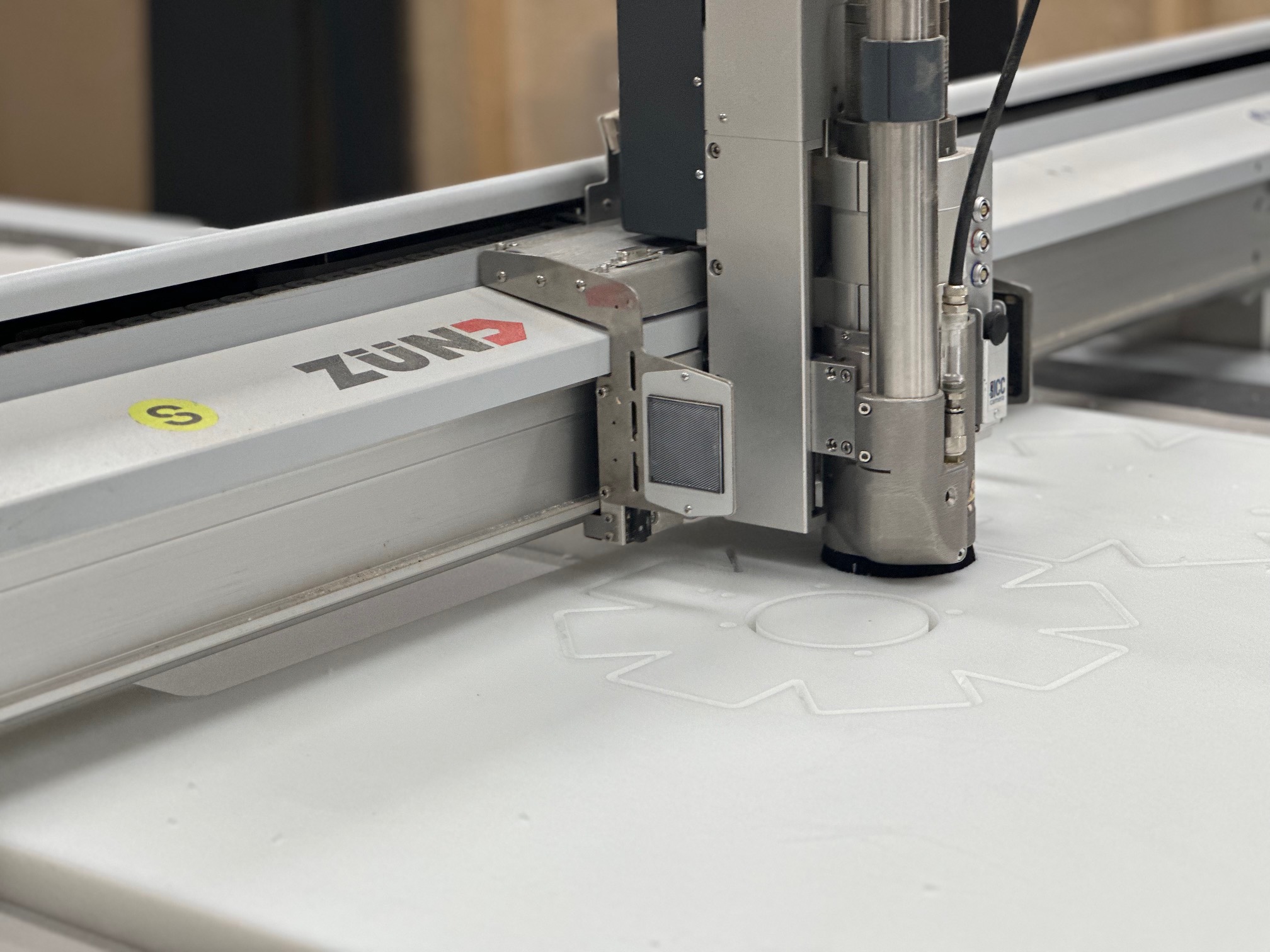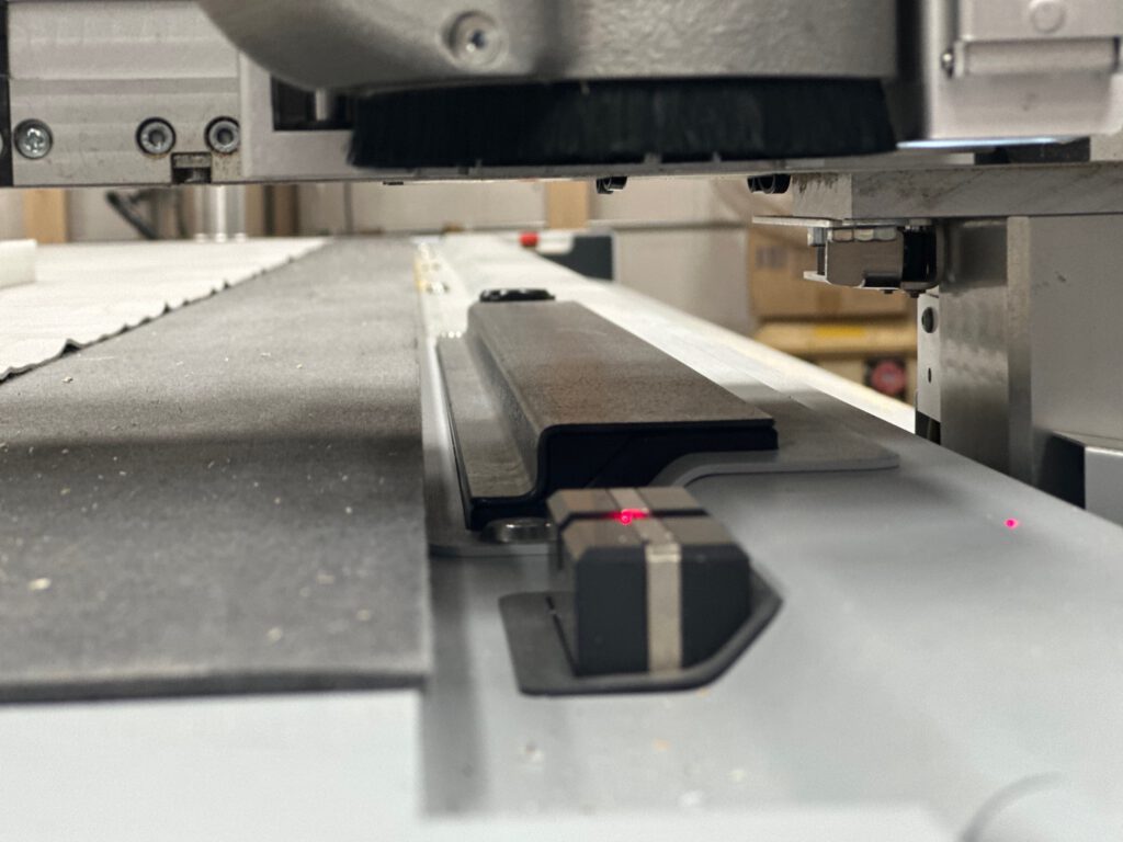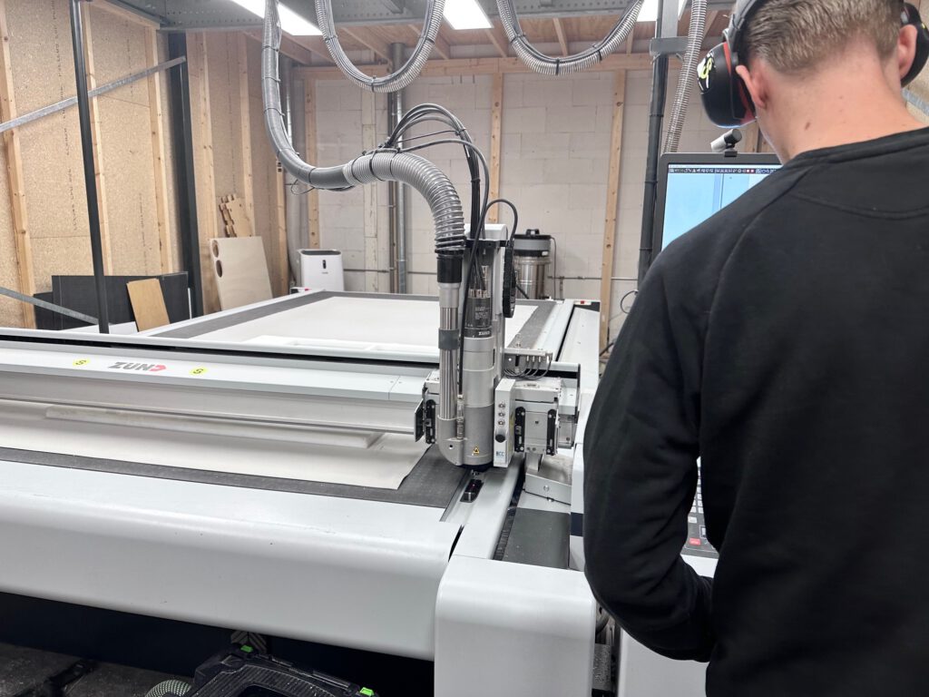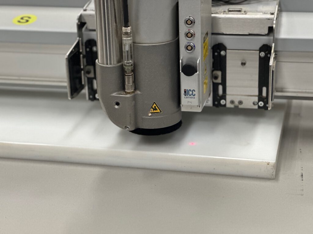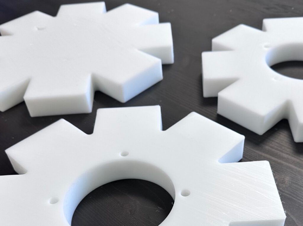 Ik ga terug naar VCarve om een DXF-pad te maken van de drie verschillende mallen. Alle gaten moeten door en door gefreesd worden. Als materiaal gebruik ik POM (PolyOxyMethylene, ook bekend als Delrin): een sterke, stijve en slijtvaste kunststof met hoge maatvastheid, veel gebruikt in precisie-onderdelen zoals tandwielen, lagers en scharnieren. Het is food-safe en hecht nauwelijks aan siliconenrubber vanwege de lage oppervlakte-energie. Voor de zekerheid breng ik een dun laagje lossingsspray aan, zodat eventuele vastzuiging op platte vlakken wordt voorkomen. Het POM leg ik op de Zünd freesmachine. Het vacuümbed houdt de plaat stevig vast. De frees snijdt door het hele materiaal heen, waardoor de 30 mm plaat niet gedraaid hoeft te worden. Dit geeft een strakke freeslijn, wat ten goede komt aan het gietresultaat. Kort daarna zijn de drie gefreesde masters klaar. Met een ontbraammes verwijder ik de laatste vezeltjes en breng ik opnieuw lossingsspray aan.
