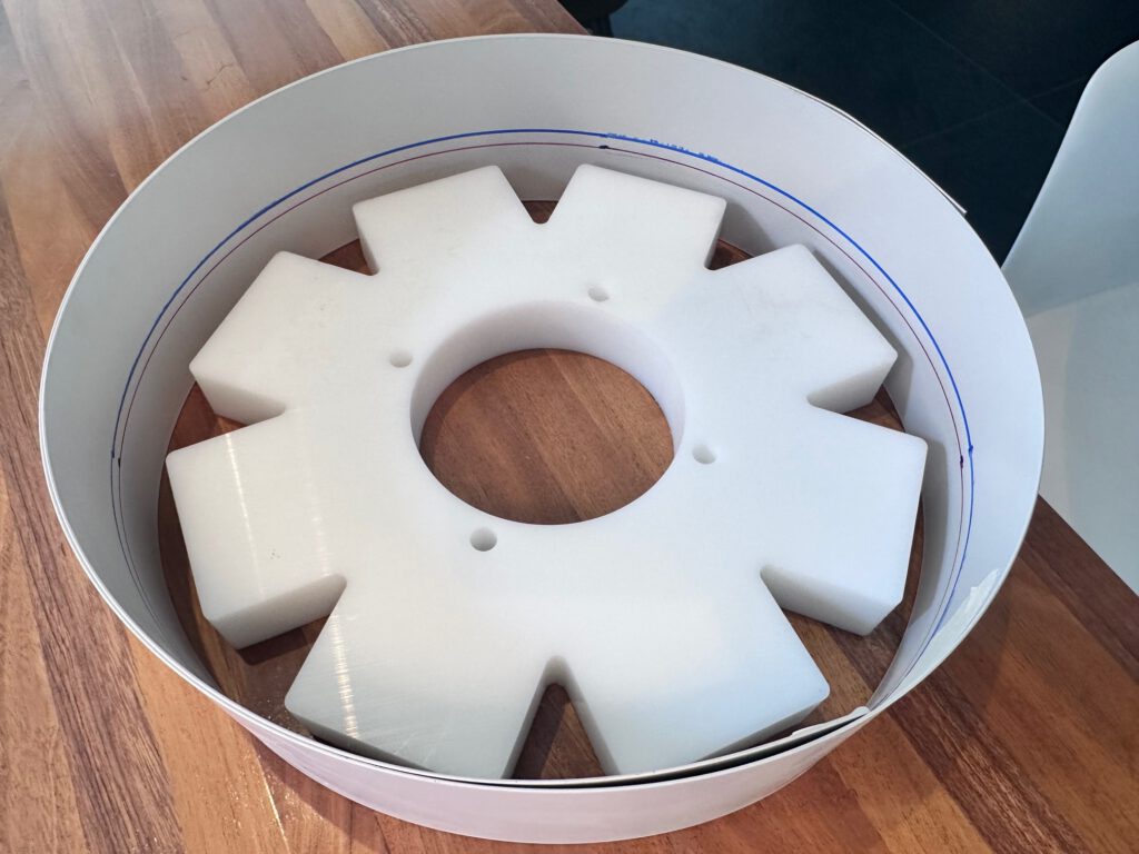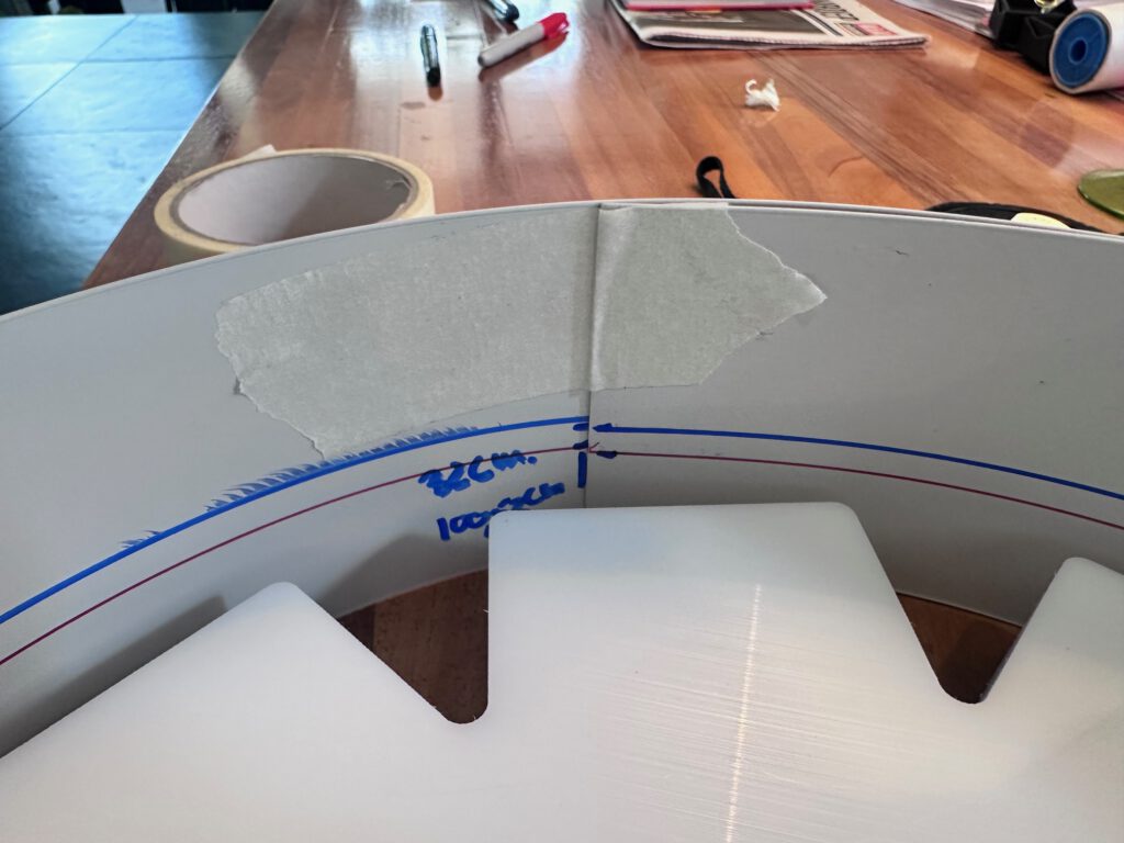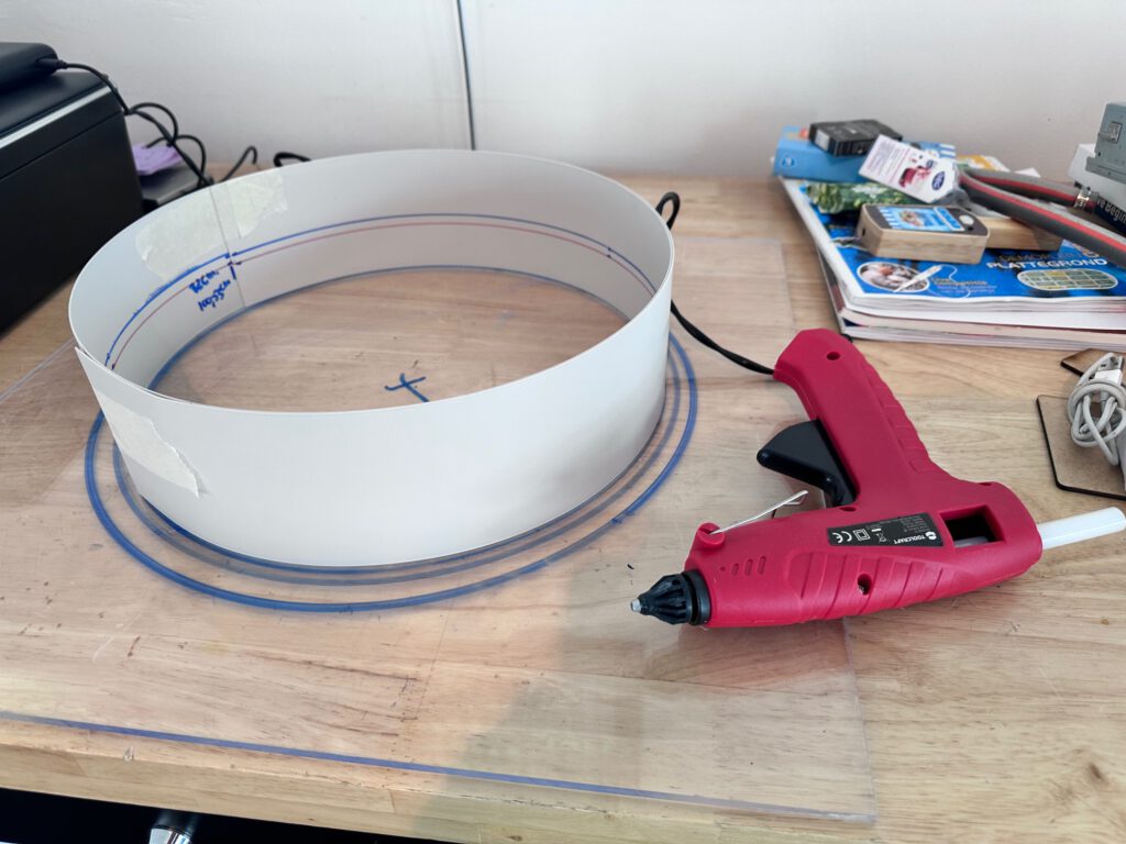 De rand van de mal maak ik van een flexibele strip van 80 mm hoog en 180 cm lang. Op basis van de diameter van de gefreesde mal en 1 cm extra ruimte per kant bereken ik de juiste lengtes met de formule C = π × d. Deze lengtes teken ik af op de strip. Ik bevestig de strip waterdicht op een onderplaat met een lijmpistool: stevig genoeg tijdens het gieten, maar ook eenvoudig los te maken. Waterdichtheid is cruciaal om te voorkomen dat vloeibaar gietrubber wegloopt via openingen.