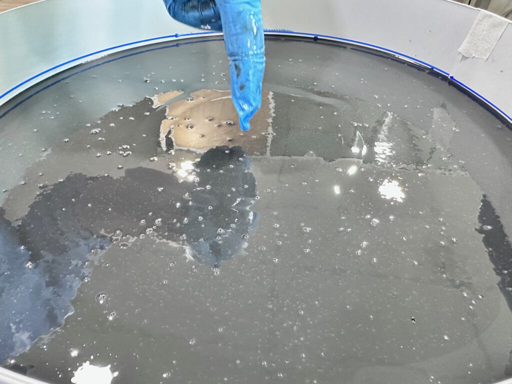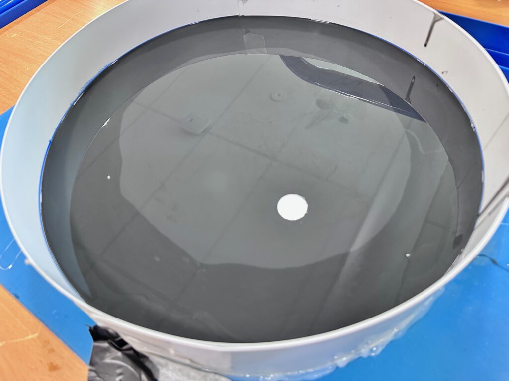 Bij controle van de giet-level kom ik 3 mm tekort. Ik reken opnieuw en ontdek dat ik te weinig heb ingeschat omdat ik uitging van de dichtheid van water. Siliconenrubber blijkt 5–15% zwaarder te zijn. In plaats van 1,4 liter heb ik dus 1,6 liter nodig. Gelukkig heb ik altijd marge in mijn materiaalvoorraad en kan ik het direct aanvullen.