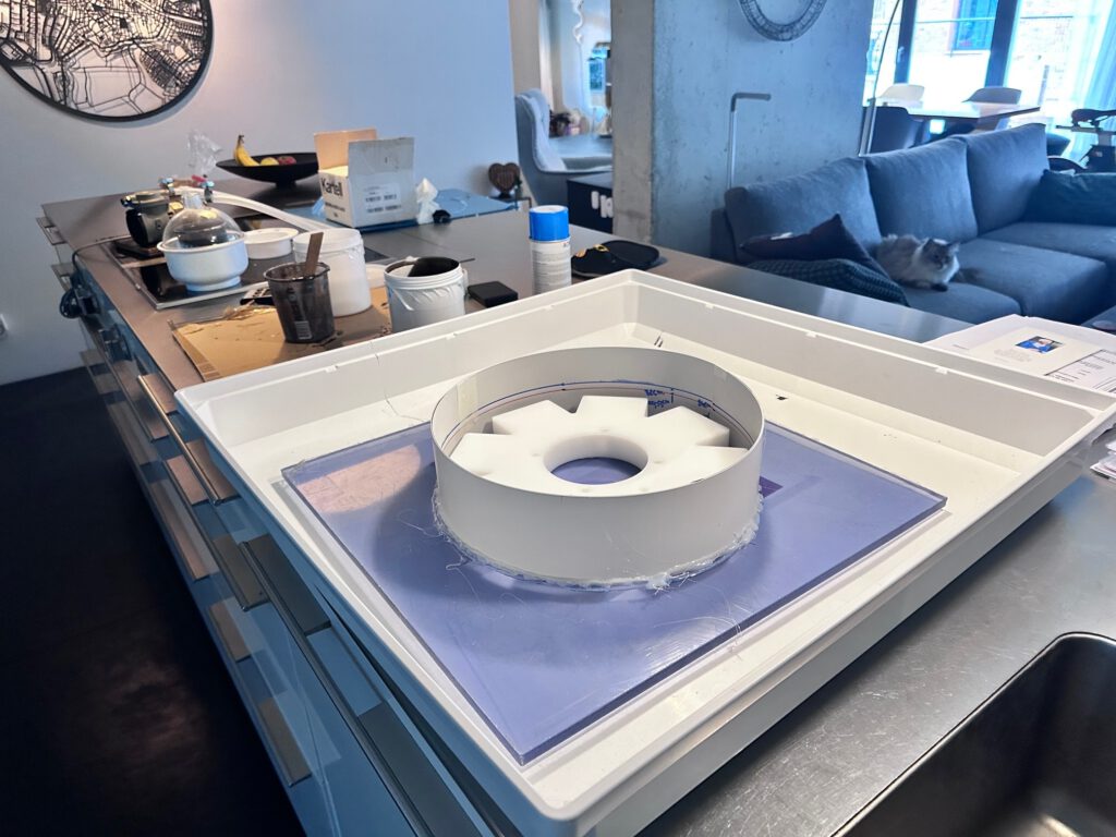 Ik produceer drie siliconen mallen waarmee lichtobjecten uit epoxy gegoten gaan worden. De opdrachtgever wil mallen met een giethoogte van 30 mm, zodat op betrouwbare wijze panelen gegoten kunnen worden.