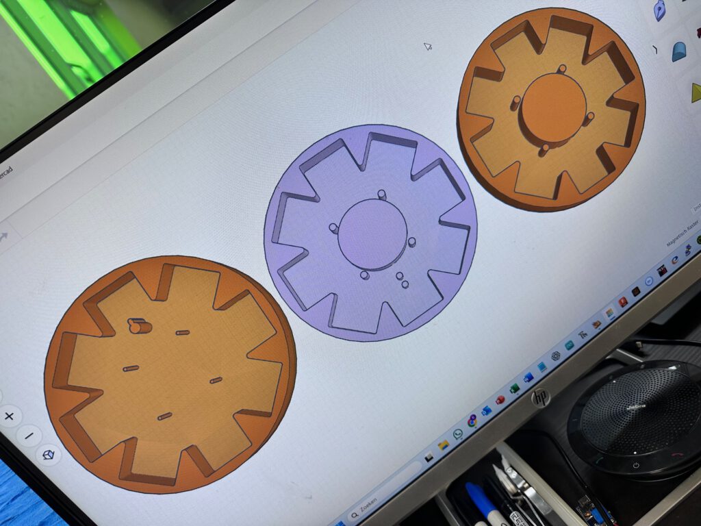Voor de 3D-tekening gebruik ik ThinkerCad, een pakket van de makers van AutoCAD en Fusion360. ThinkerCad laat mij eenvoudig tekeningen importeren en biedt de mogelijkheid om rond het ontwerp heen te vliegen en het resultaat te presenteren. Ik importeer de tekening als SVG en maak een extrude van 30 mm hoog. Dit zet ik om in een “exclude”, zodat ik een uitsnede kan maken. Voor de mal zelf maak ik een cilinder van 35 mm hoog en een diameter die overal 10 mm extra ruimte geeft. Zo ontstaat een representatie van de siliconen mal waarin epoxy later goed loskomt zonder schade.