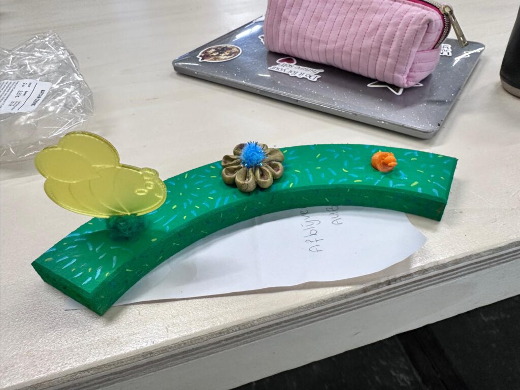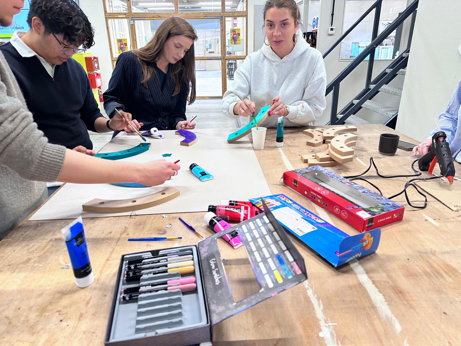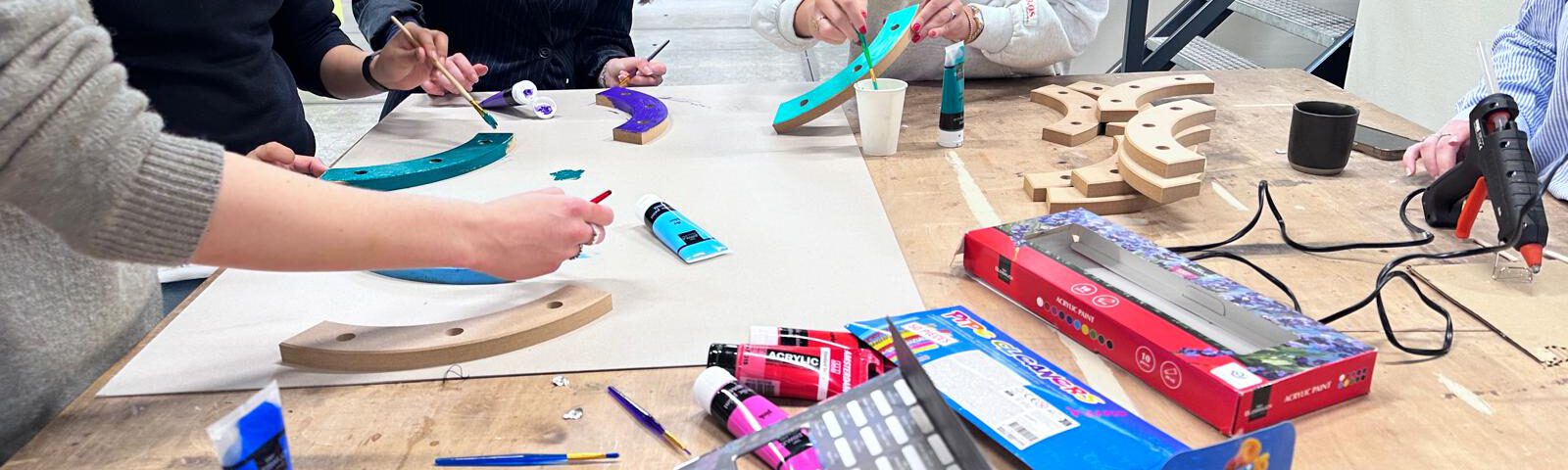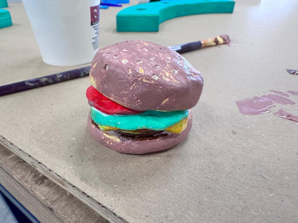 De technische fase gaat over in de creatieve. Acrylverf, lijmpistool, extra materialen van huis — alles is welkom. De tafel staat vol met MDF-bogen in felle kleuren, gipsen bolletjes, 3D-geprinte objecten en lasersnijresultaten. Iemand heeft een hamburger gemaakt van klei. Een ander heeft een krans met een groene basis, pompons en een lasergesneden bloem. Geen twee zijn hetzelfde.