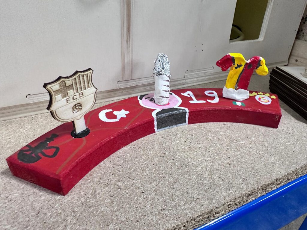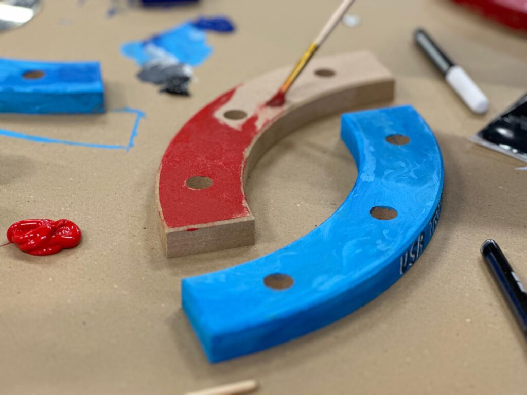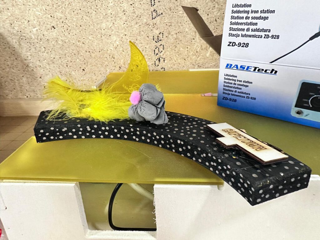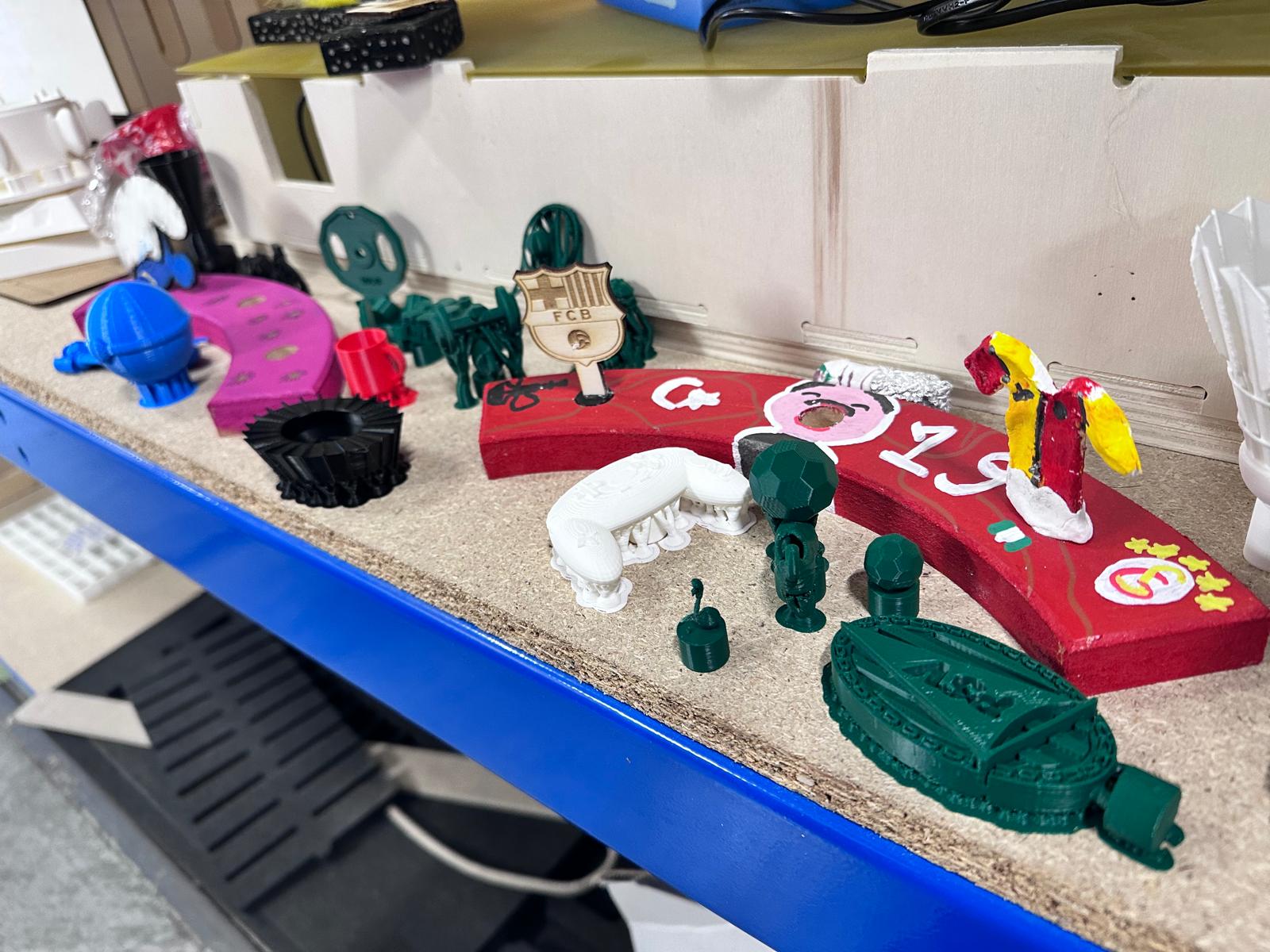 De technische fase gaat over in de creatieve. Acrylverf, lijmpistool, extra materialen van huis — alles is welkom. De tafel staat vol met MDF-bogen in felle kleuren, gipsen bolletjes, 3D-geprinte objecten en lasersnijresultaten. Iemand heeft een hamburger gemaakt van klei. Een ander heeft een krans met een groene basis, pompons en een lasergesneden bloem. Geen twee zijn hetzelfde.