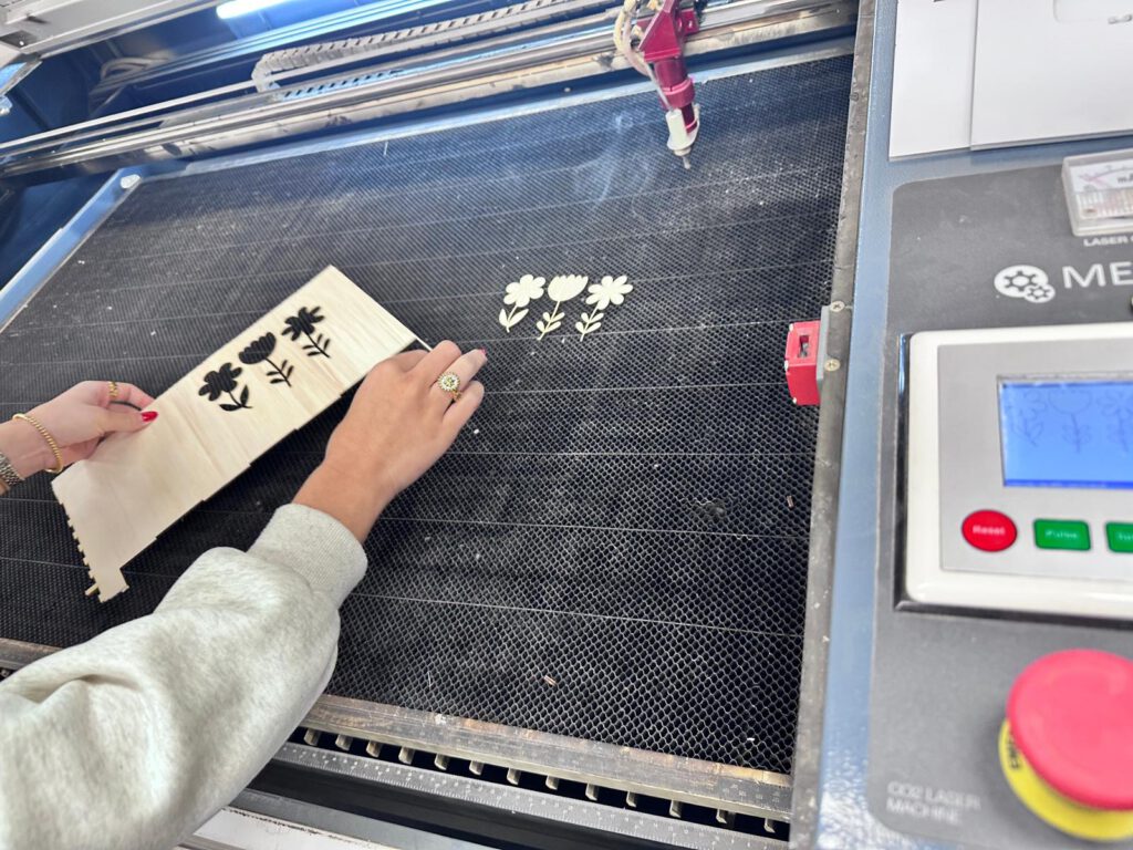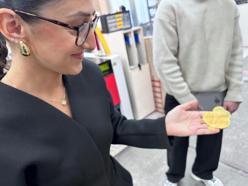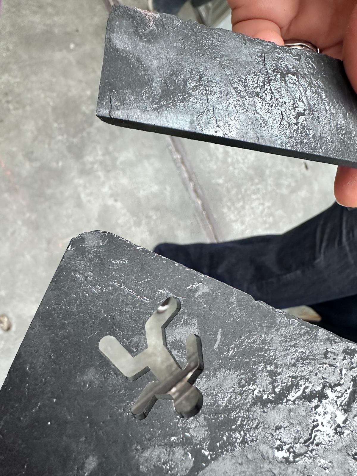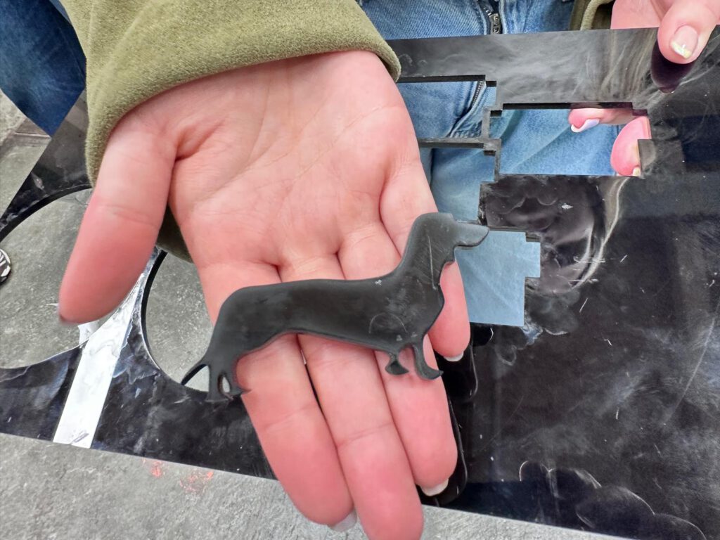 Eén student gaat een stap verder: een klein poppetje, gesneden uit leisteen via waterjet. Een techniek die je niet dagelijks ziet in een prototypingworkshop — maar wel beschikbaar bij SPARK. Het resultaat is een minuscuul silhouet dat er na bewerking als een sierlijk object uitziet.