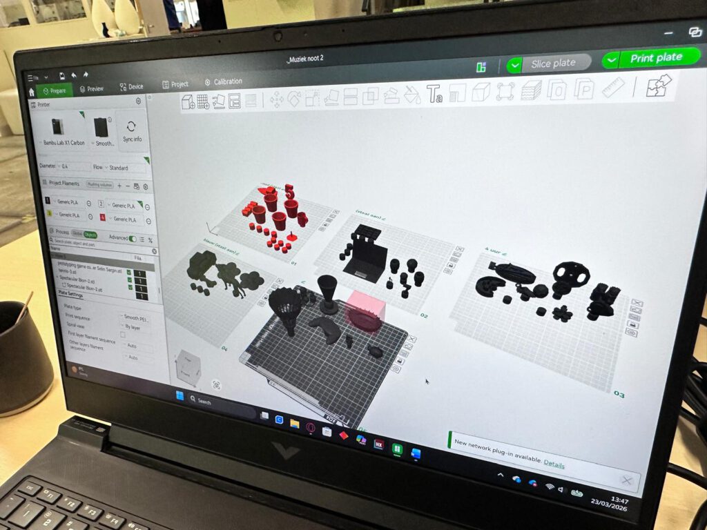 De Bambu X1C verwerkt de STL-bestanden. In de slicer zijn meerdere printplaten zichtbaar tegelijk — studenten hebben uiteenlopende objecten aangeleverd, van speelse vormen tot functionele onderdelen. De lasersnijder verwerkt de vectorbestanden — bloemen, silhouetten, stadskaartjes, een teckel uit zwart acrylaat.