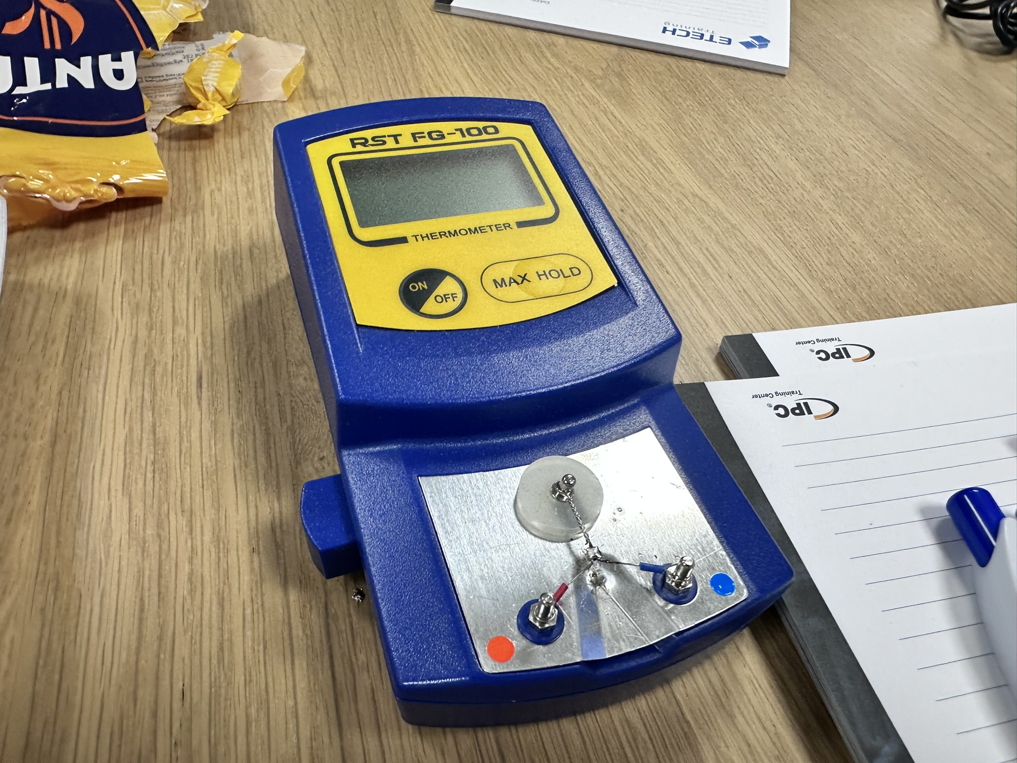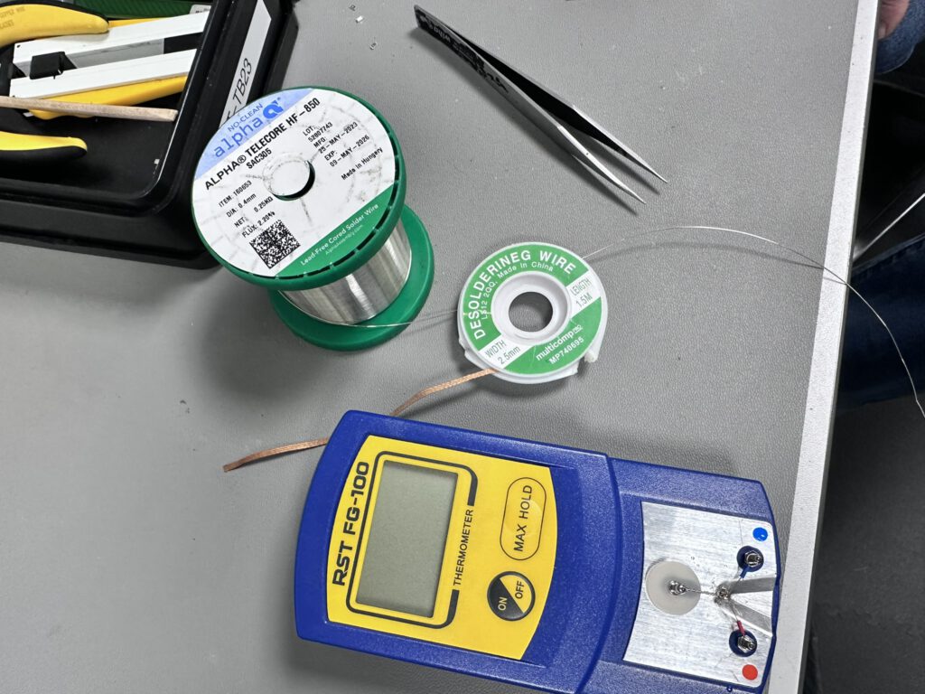 Dag één begint niet met solderen maar met meten. De RST FG-100 soldeerpuntthermometer staat op tafel — een apparaatje dat de werkelijke temperatuur aan de punt meet op het moment van contact. Niet de ingestelde temperatuur van het station, maar de échte.
