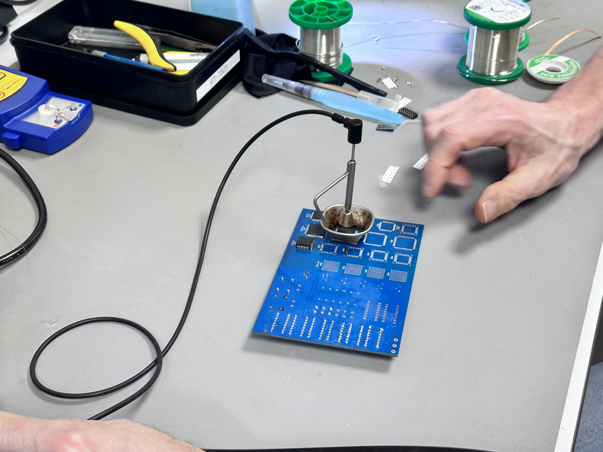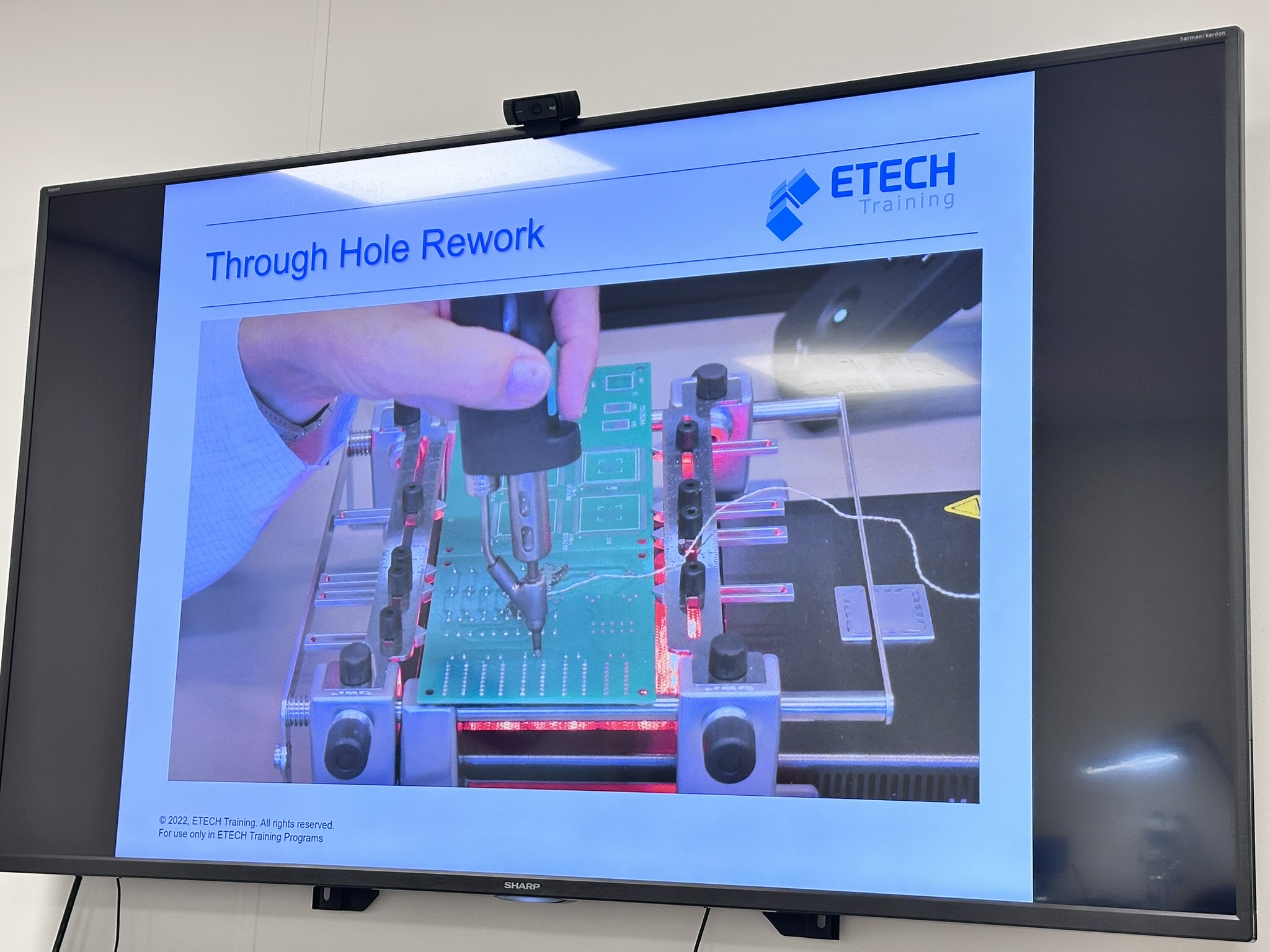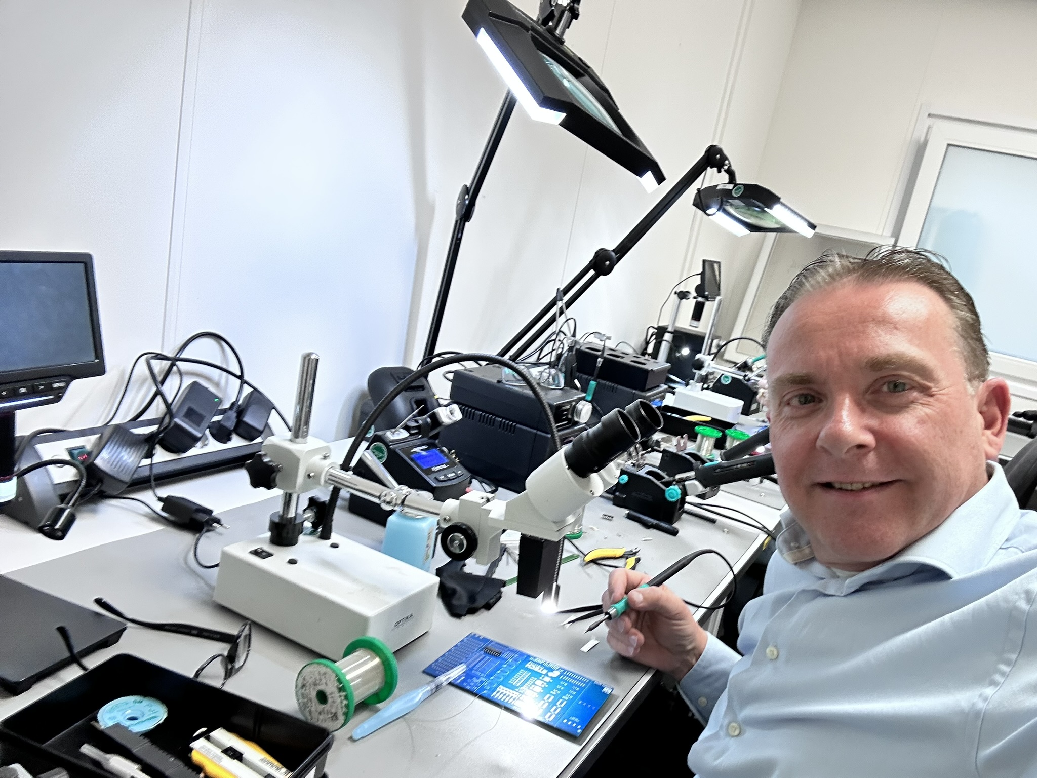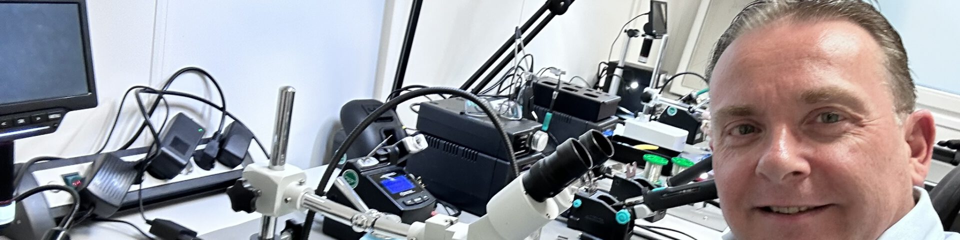 De trainingsruimte bij Etech is goed ingericht. Iedere werkplek heeft een ESD-tafelmat, polsbandje, een eigen JBC-soldeerstation, stereomicroscoop en een Tomlov digitale microscoop met scherm. Goed verlicht, ruim opgezet, alles binnen handbereik.