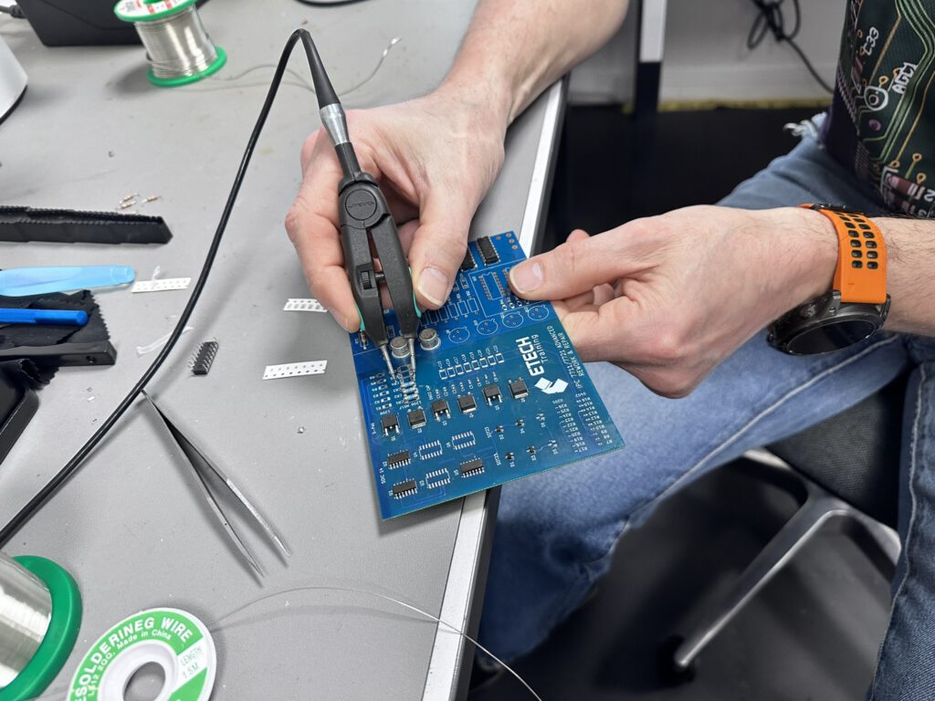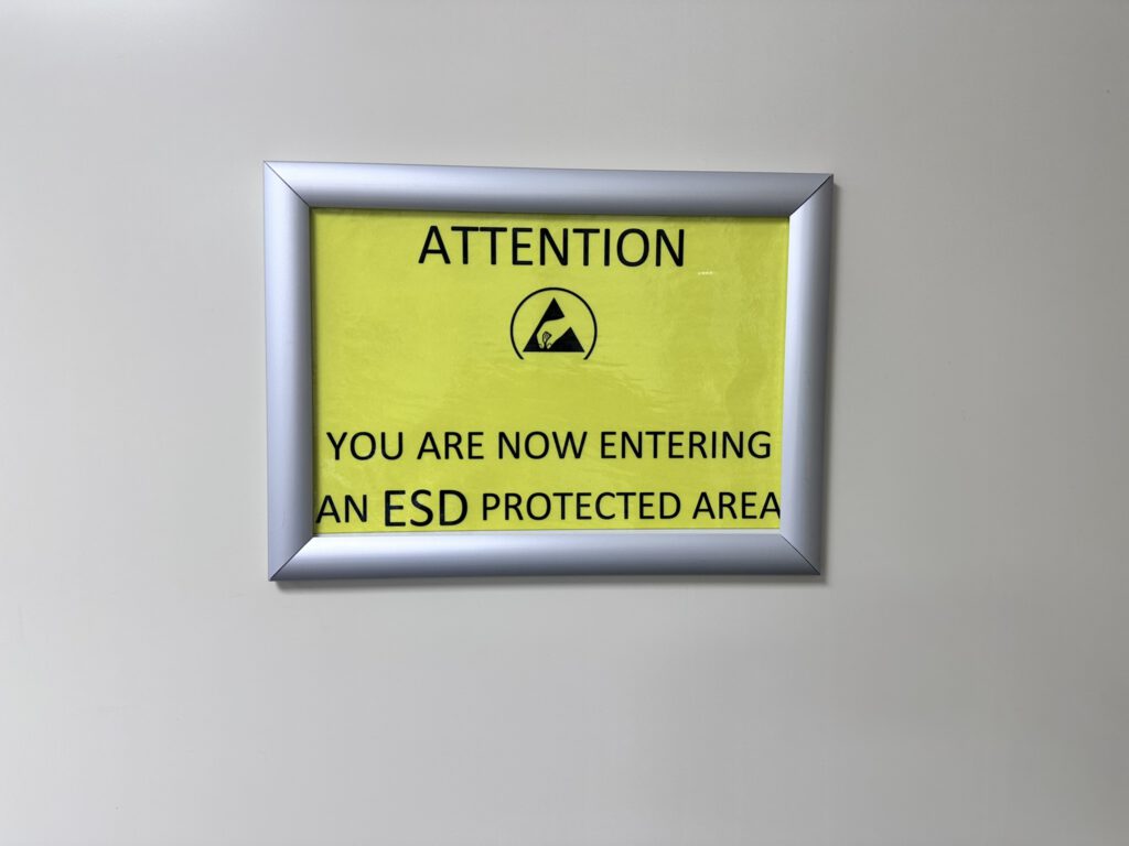 Direct bij binnenkomst hangt er een gele waarschuwingsbord aan de deur: ‘You are now entering an ESD protected area’. Dat is niet voor de show. De gehele werkruimte is ingericht als EPA — geaarde matten, polsbandjes, ESD-veilig gereedschap. Het is de eerste les van de training, nog vóór er ook maar een soldeerbout is aangestoken.