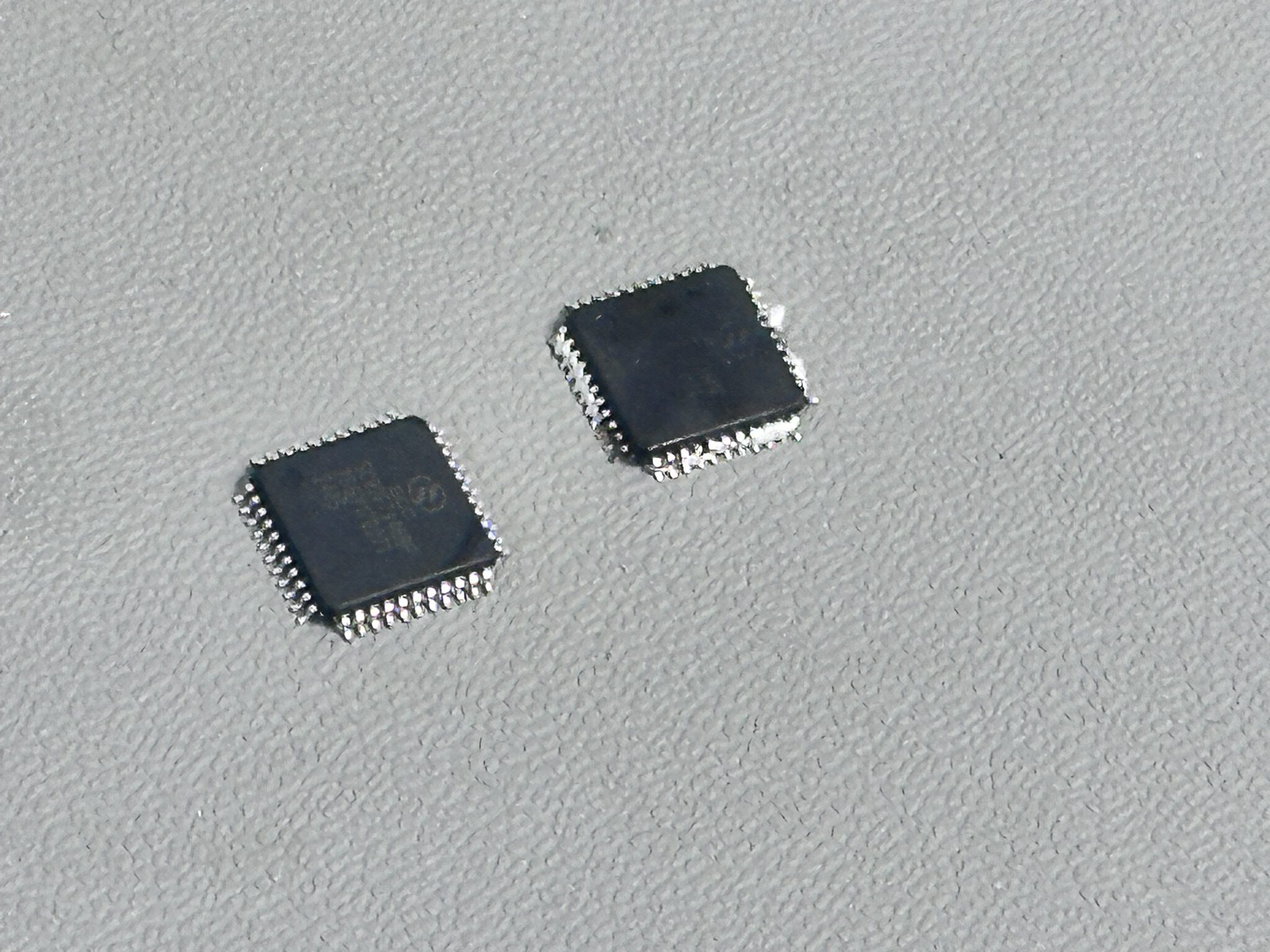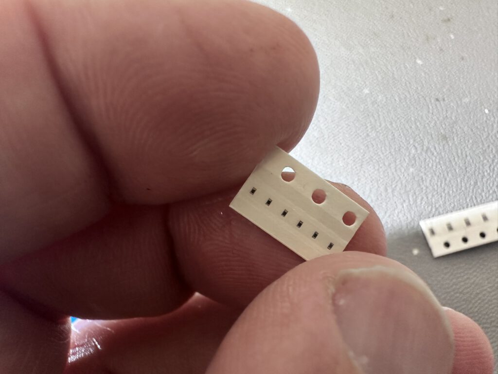 Op het board zitten ook 0402-weerstanden. Dat is 1,0 × 0,5mm. Op een drager-tapeje in de hand gehouden, ben je je al snel bewust van de schaal — twee aansluiting op minder dan een millimeter.