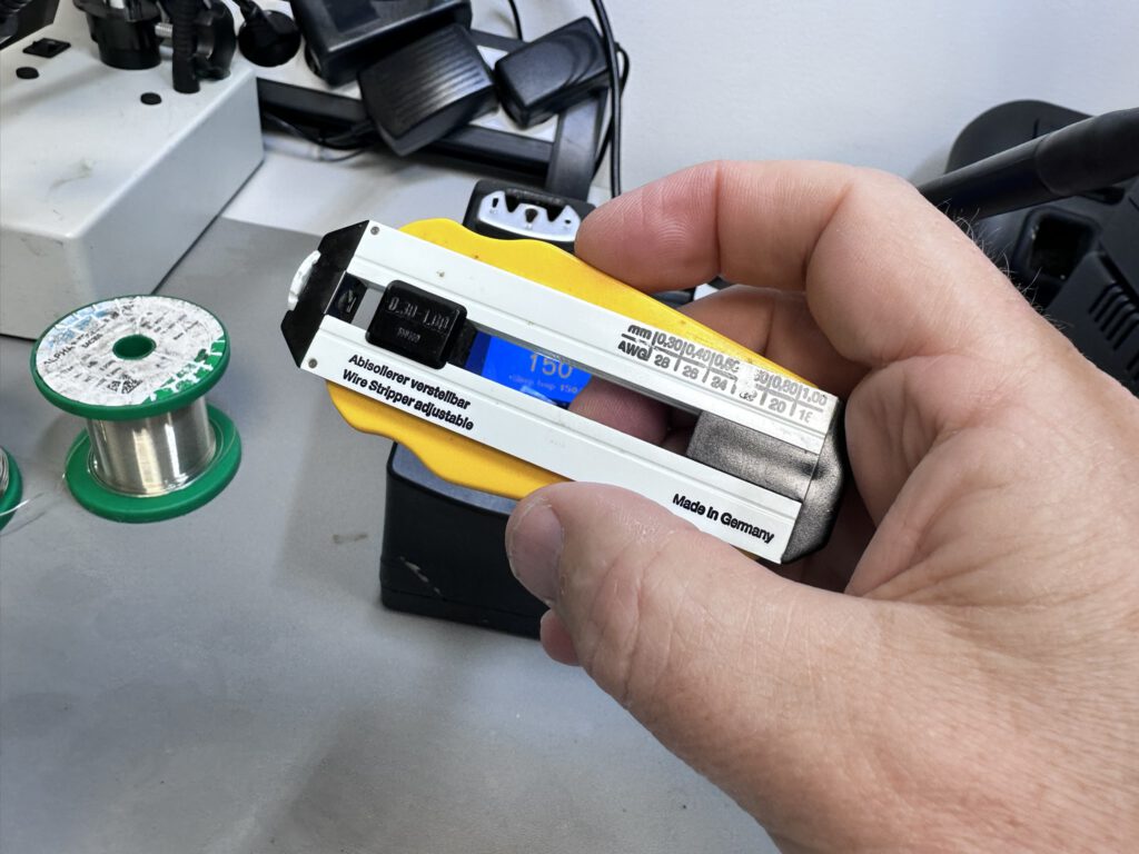 De verstelbare draadstripper — verstelbaar van 0,30 tot 1,00mm, Made in Germany — is een van de interessantere tools. Niet voor gewone bedrading, maar voor het afstrippen van ultra-dunne reparatiedraden die je over beschadigde PCB-tracks legt.