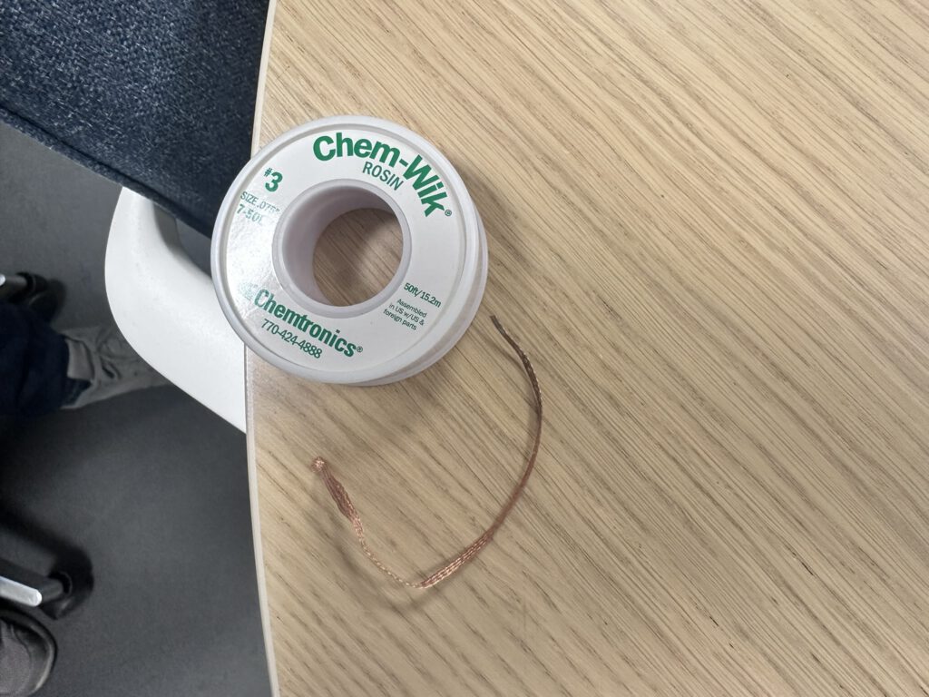 Voor het verwijderen van overtollig soldeer zijn twee desoldeerwicken aanwezig: de Chemtronics Chem-Wik #3 (1,78mm, rosin) voor fijn werk rond kleine SMD-componenten, en een bredere Multicomp-wick van 2,5mm voor grotere pads en IC-voetafdrukken. De Chem-Wik is de favoriet van de trainer — goede capillaire werking, makkelijk te doseren.
