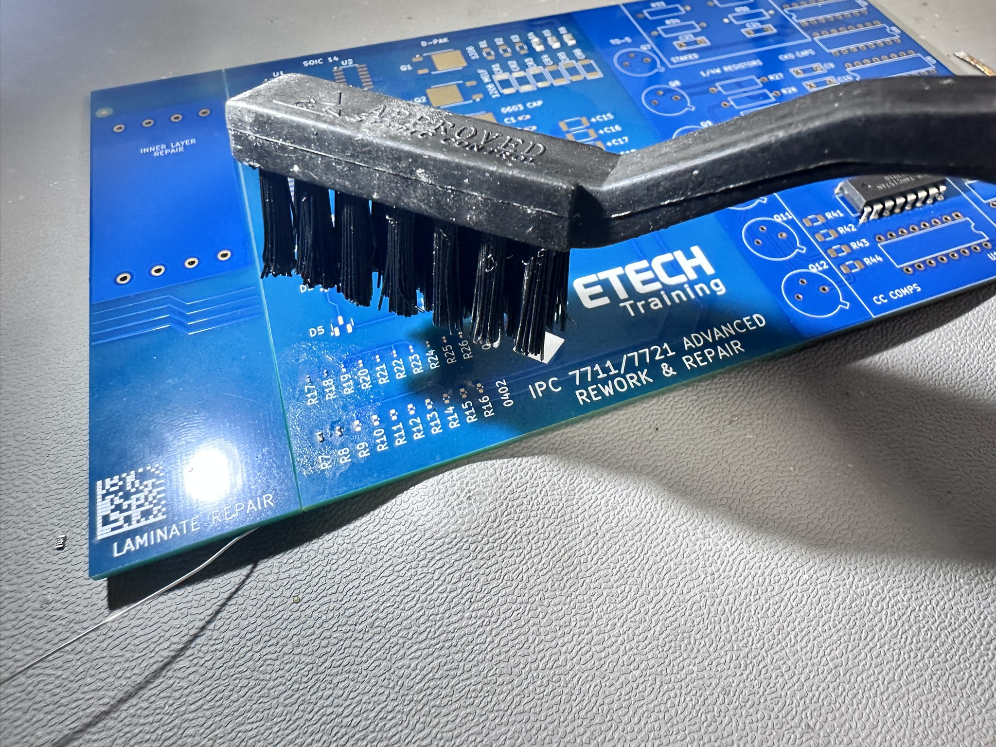 De eerste grote oefensessie gaat over het correct plaatsen en solderen van SMD-componenten op het Etech trainingsboard — een blauw board vol footprints voor SOIC, PLCC, QFP, D-PAK, 0402-weerstanden en meer. Het board is ook deels benut voor laminate repair en inner layer repair — dat komt dag twee aan bod.