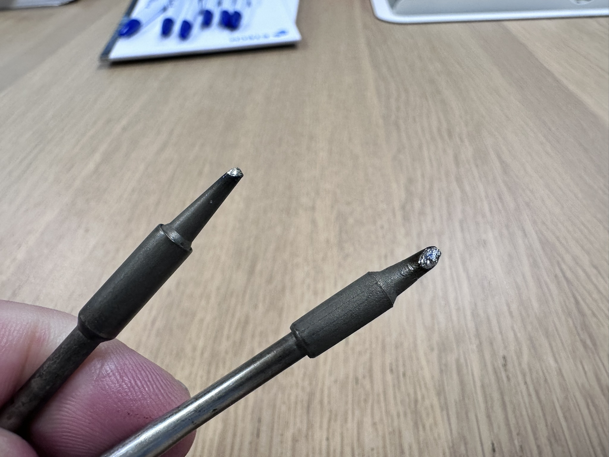 De meting is ook een manier om punten te beoordelen. Twee versleten punten liggen naast elkaar — beide zien er grijsbruin uit, amper nog vertind. De thermometer bevestigt wat je ziet: de warmteoverdracht is slecht. Nieuwe punten zijn goedkoper dan een beschadigde printplaat.