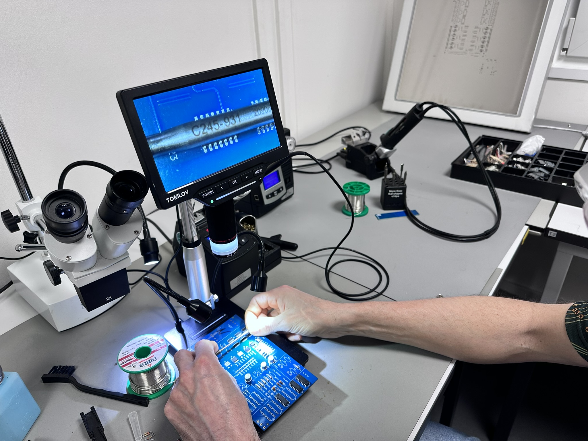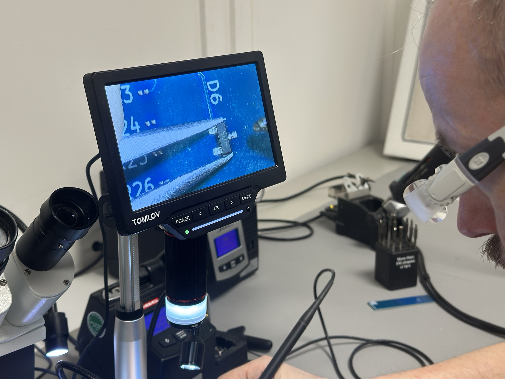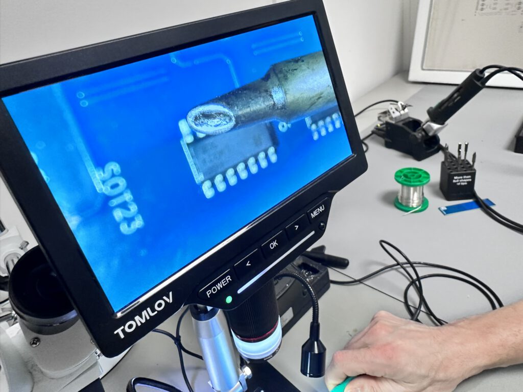 Na reiniging volgt inspectie. De Tomlov digitale microscoop brengt de verbindingen vergroot in beeld — een SOT-23 transistor met drie aansluitingen, een SOIC-voetafdruk met een beginnende koude verbinding aan één pin. Zichtbaar, beoordeelbaar, corrigeerbaar.