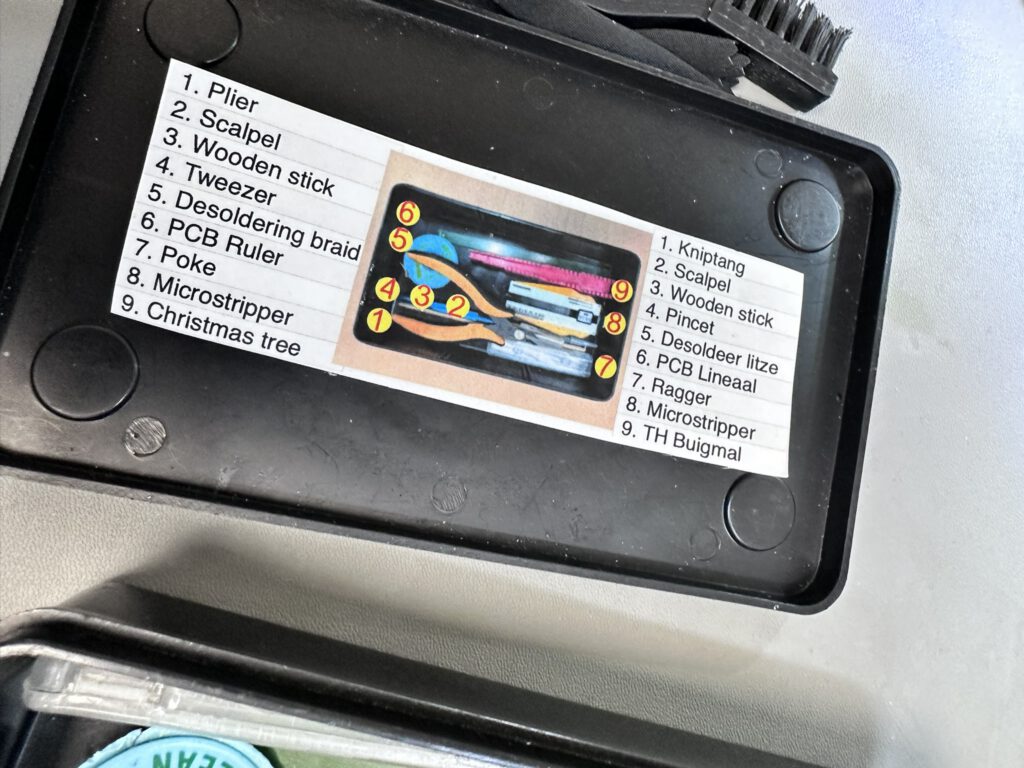 Iedere deelnemer krijgt een gereedschapsbak. Twee lijstjes op het deksel — Nederlands en Engels — tonen wat erin zit: kniptang, scalpel, wooden stick, pincet, desoldeerwick, PCB-lineaal, ragger, microstripper, TH buigmal (of: Christmas tree).
