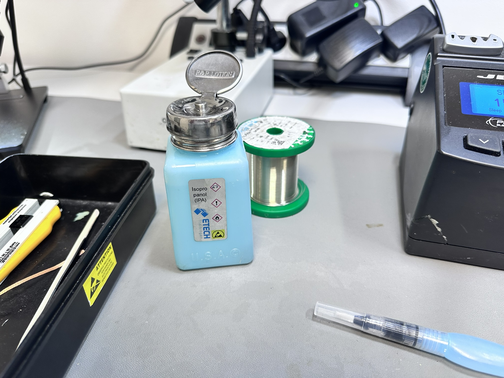 Na het solderen reinig je de flux-resten met IPA. Een ECO-pompflesje op de werkbank — gevuld met isopropanol — en een nylon ESD-borstel doen het werk. De borstel haalt flux-residuen los, een lint-free doekje absorbeert de vloeistof. Het is meer dan esthetiek: flux-resten kunnen corrosie veroorzaken en de elektrische isolatieweerstand verlagen.