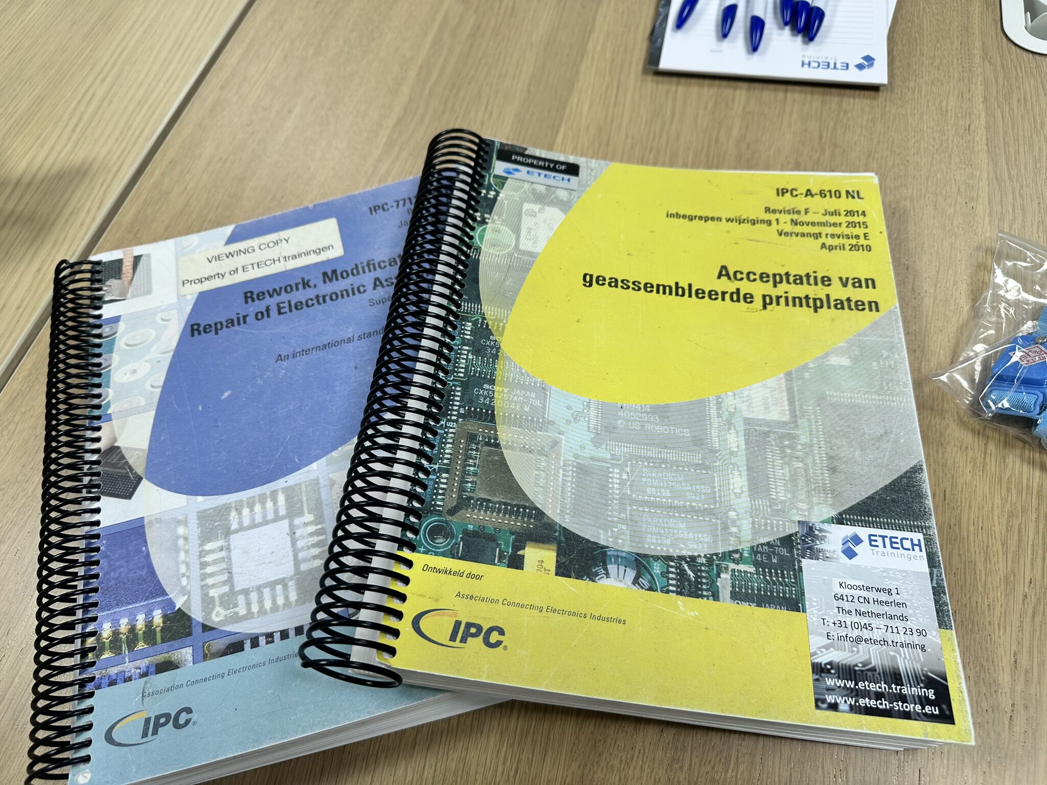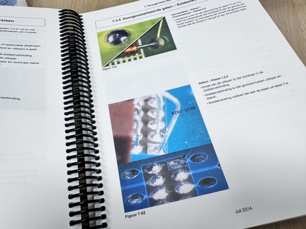 De training werkt direct met de officiële IPC-documenten. Op tafel ligt de IPC-7711/7721 Revision C (Rework, Modification and Repair of Electronic Assemblies) en de IPC-A-610 NL (Acceptatie van geassembleerde printplaten). Beide zijn dikke spiraalgebonden naslagwerken vol maatvoering, fototabellen en klasse-eisen.