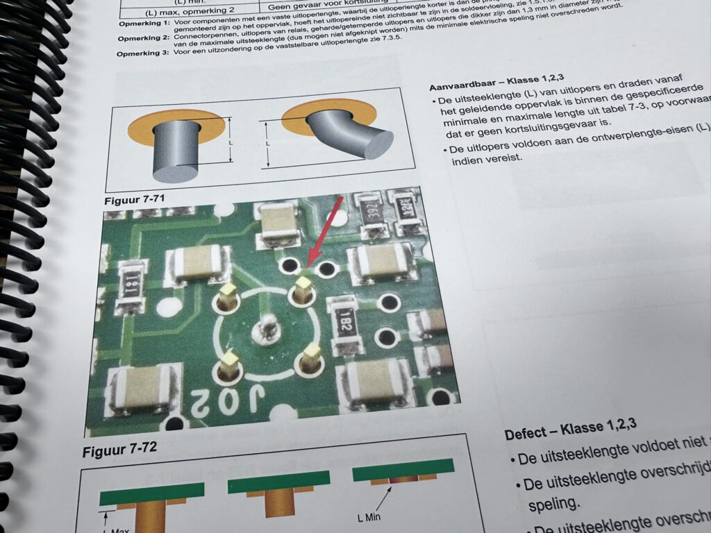 Wat opvalt: veel wat je in de praktijk als “goed genoeg” zou beoordelen, valt in Klasse 2 onder procesindicator of zelfs defect. Een iets te bolle soldeervulling, een lead die niet volledig zichtbaar is door het gat, een lichte flux-onzuiverheid vlak bij een pad. De norm vraagt meer dan oog-esthetiek — het vraagt reproduceerbaarheid.