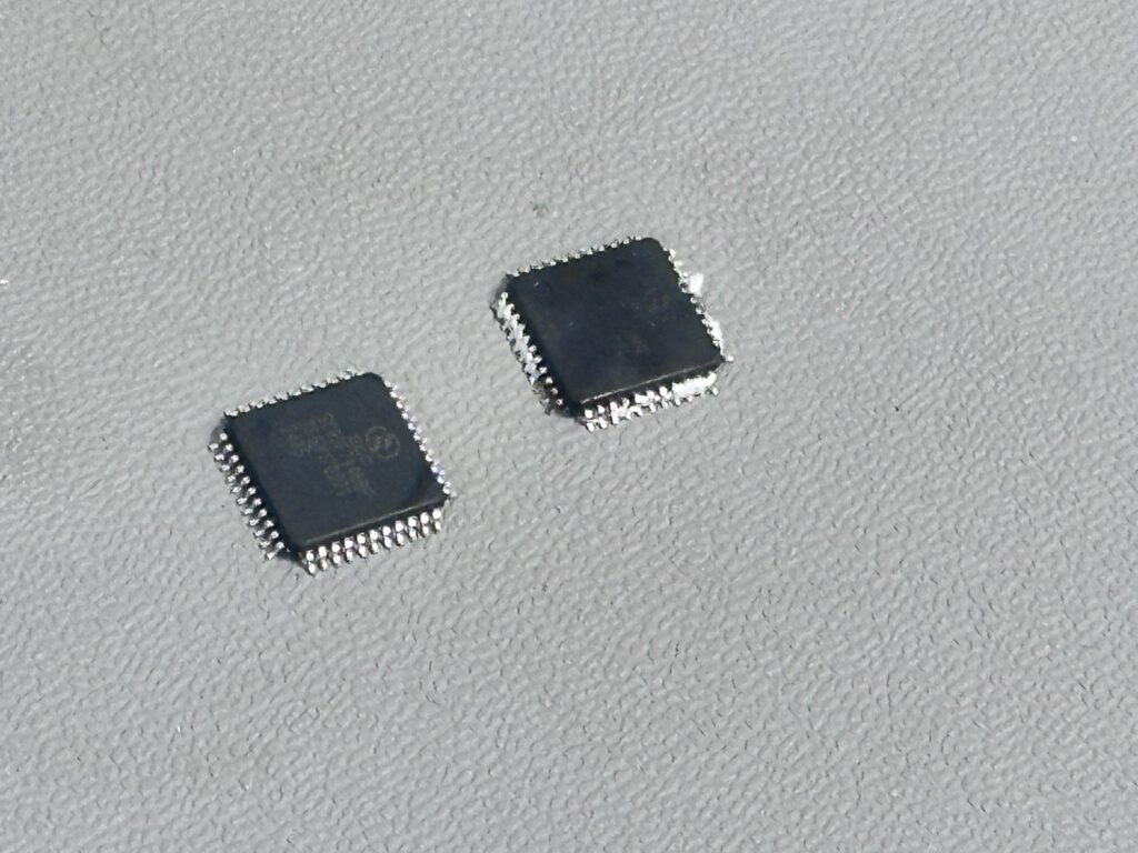 Gull-wing IC’s — zoals SOIC en QFP — vraagen om een specifieke aanpak. Eerst twee tegenoverliggende hoeken vastsolderen om uitlijning te fixeren. Dan de overige aansluitingen met een tip die de juiste massa heeft voor de pitchmaat. Op het scherm van de Tomlov digitale microscoop zie ik live mee hoe de verbindingen eruit zien tijdens het solderen.