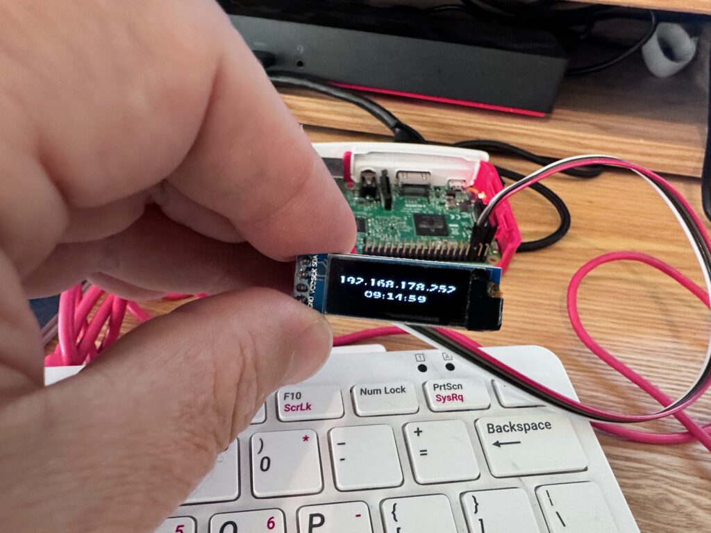 Na een daemon-reload en enable –now draait het display autonoom en toont het iedere twee seconden de actuele status, het IP-adres en de lokale tijd.