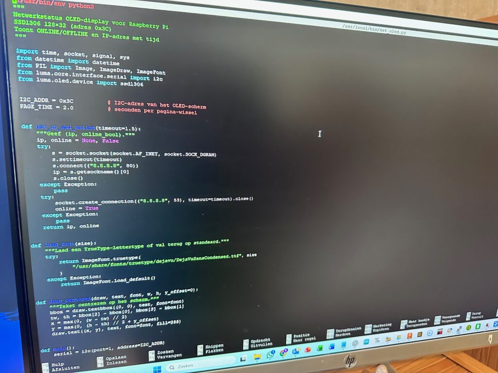 Hierop wil ik direct kunnen zien of het systeem online is, zonder in te loggen. Het display toont realtime de netwerkstatus, het IP-adres en de lokale tijd, zodat ik ook bij IoT-projecten zonder scherm in één oogopslag zie of de Pi verbonden is met het netwerk.