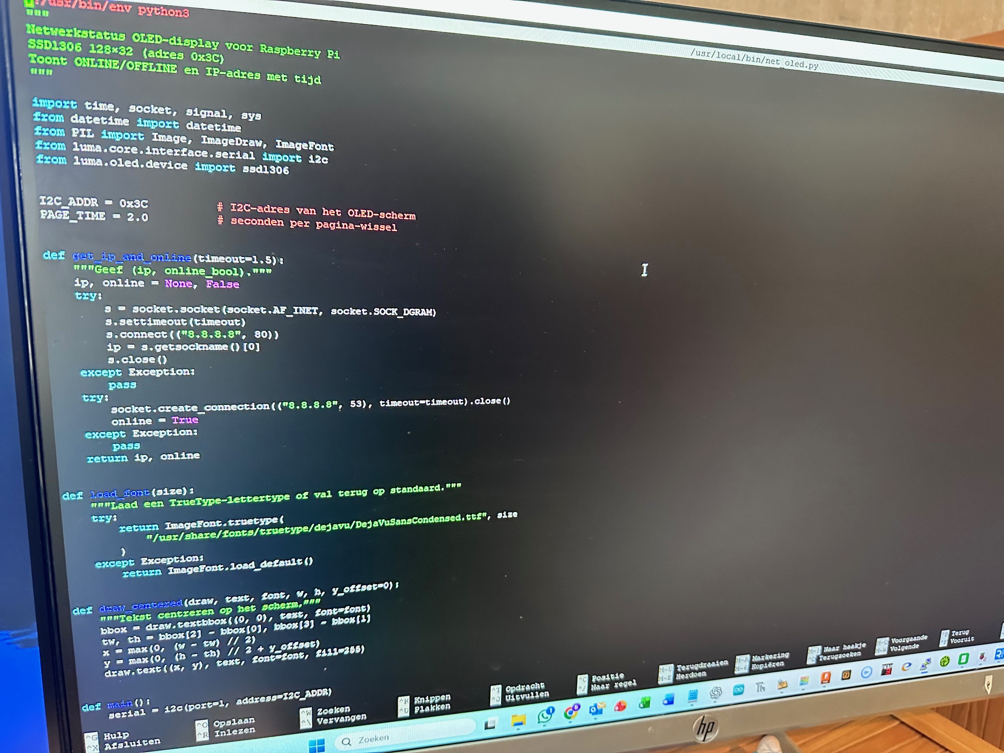 De voeding van het OLED-display is aangesloten op Pin 1 (3.3 V) en Pin 6 (GND). Voor de I²C-communicatie gebruik ik Pin 3 (GPIO2 / SDA) en Pin 5 (GPIO3 / SCL). Met het commando i2cdetect -y 1 controleer ik of het display correct herkend wordt als 0x3C, waarna ik het Python-programma schrijf.