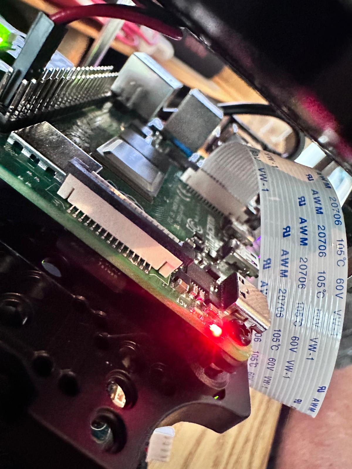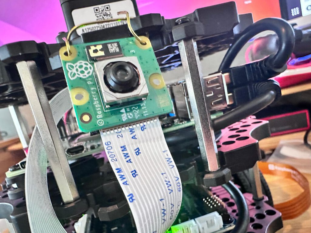 Tijdens de sessie voeg ik ook een USB HD-camera toe voor een live camerastream, en probeer ik een Raspberry Pi Camera Module 3 aan te sluiten via de CSI-poort. Die laatste vraagt wat meer geduld — de flatcable heeft een specifieke richting en hot-swappen terwijl de Pi aan staat is een slecht idee. Dat laatste doe ik toch. Eenmalig.