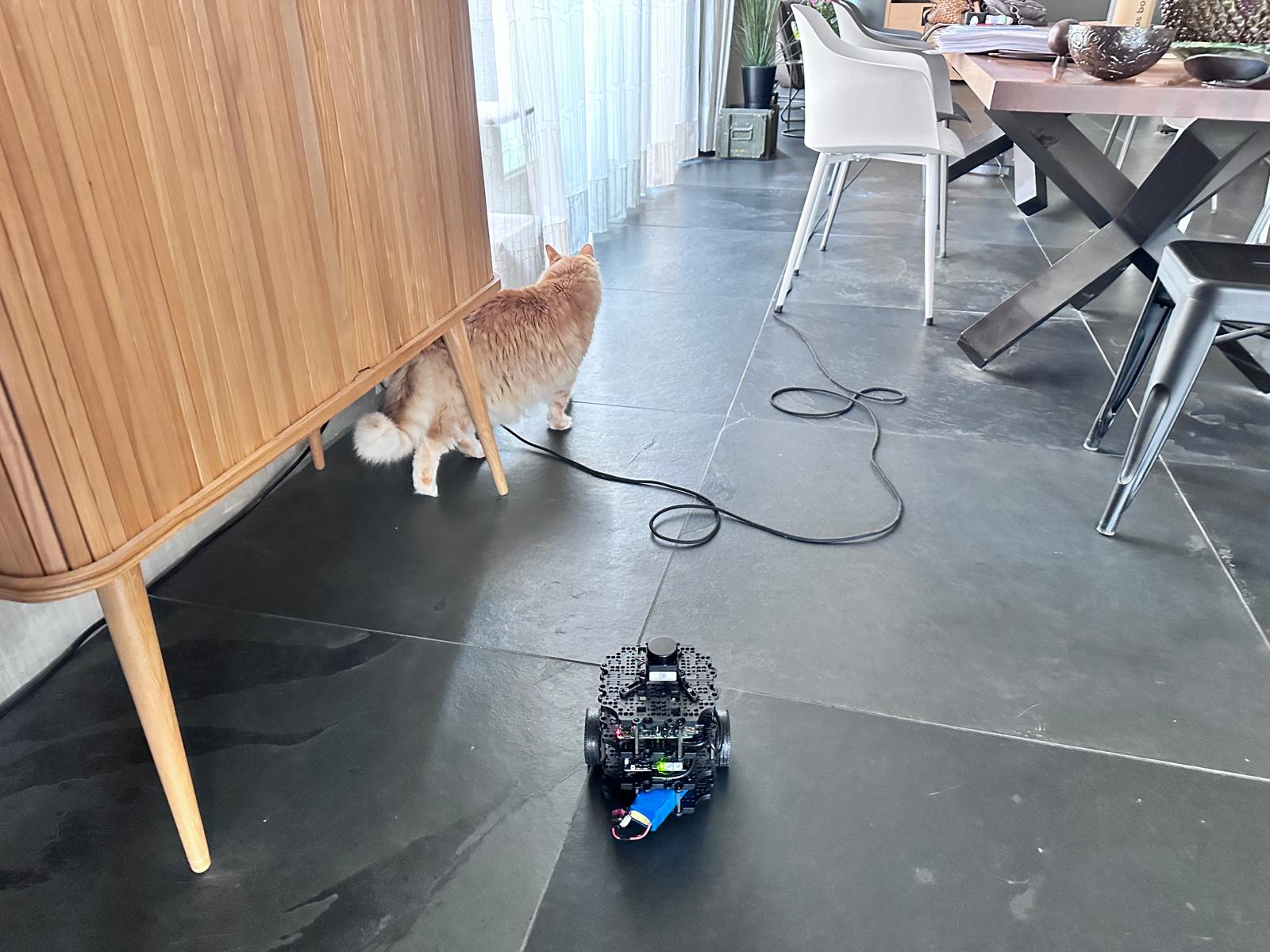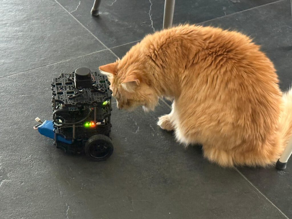 De robot rijdt. De LiDAR scant. De camera streamt. Cartographer bouwt de kaart. Nav2 stuurt de robot naar zijn doel. En dan verschijnt de kat — neust aan het platform, loopt er een rondje omheen, en trekt zich terug onder de kast. Voor de TurtleBot3 is hij gewoon een obstakel. Voor mij is het de bevestiging dat alles werkt.