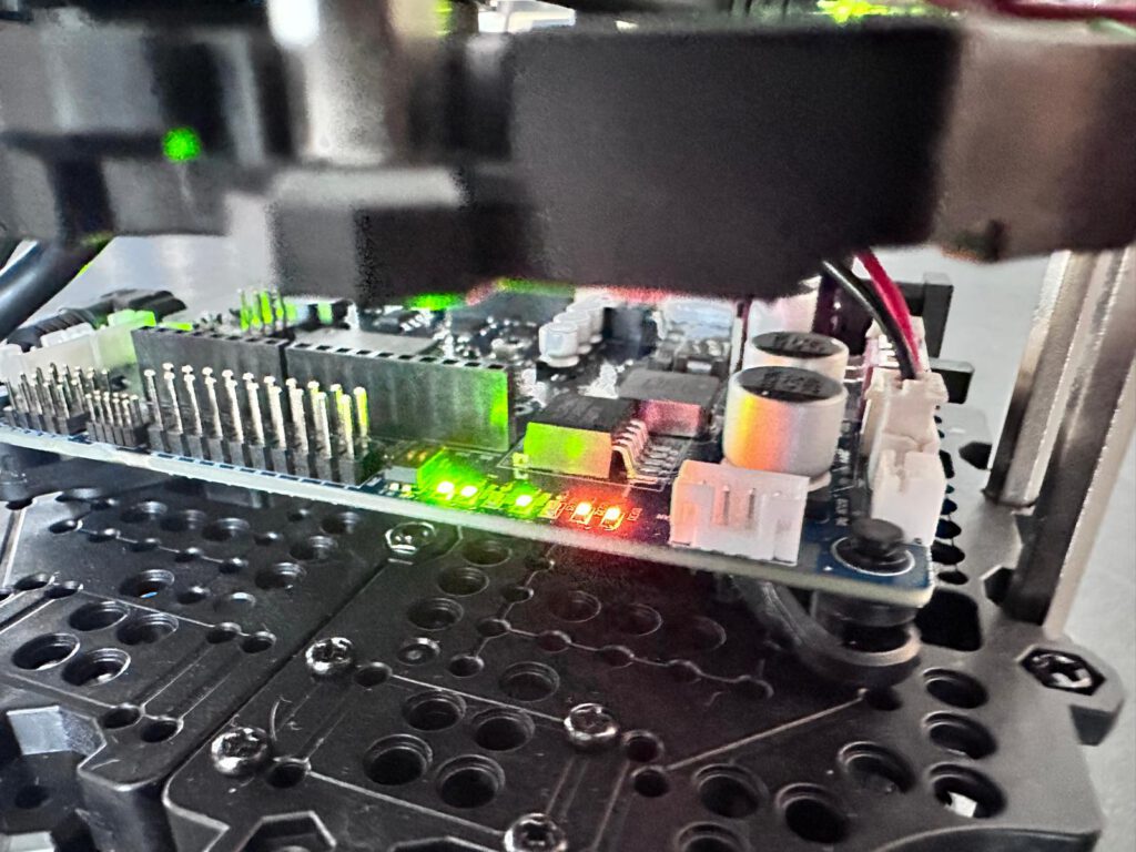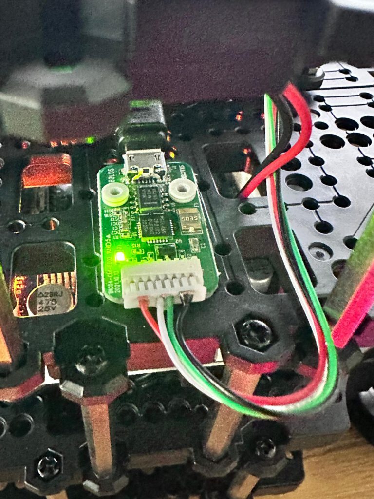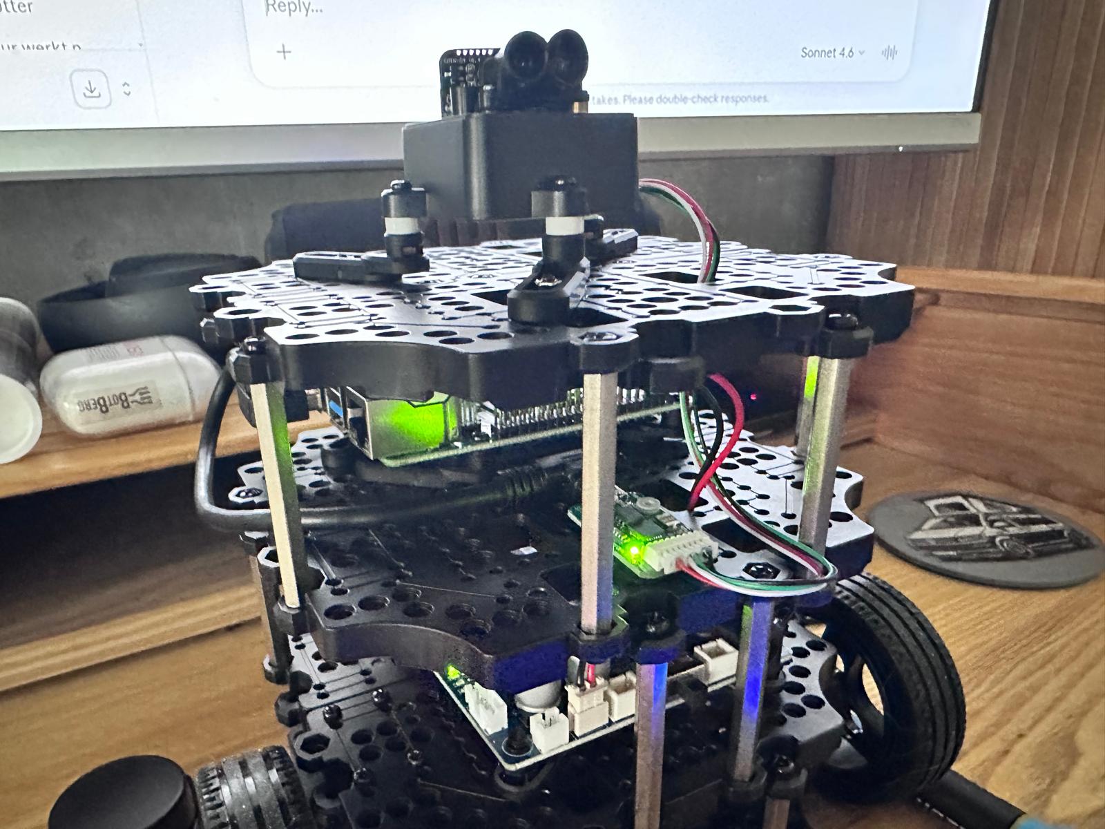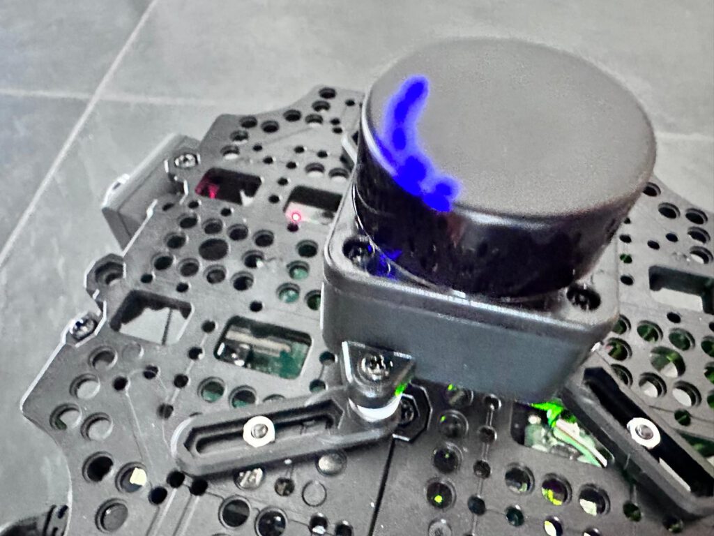 Bovenop de stapel zit de LDS-03 LiDAR van ROBOTIS. Dit is een recent exemplaar — ROBOTIS heeft de sensor gewisseld vanaf oktober 2025. De LDS-02 is discontinued en vervangen door de LDS-03, waarbij het externe motortje is komen te vervallen. Dat heeft voordelen voor het onderhoud — geen slijtende mechanische onderdelen, geen losse connector die trillingen oplevert — maar het maakt validatie tijdens de opbouw wat lastiger. Bij de LDS-02 zag je meteen of de sensor draaide. Bij de LDS-03 is dat visueel minder evident. Gelukkig zit er bovenin de behuizing een blauw ledje dat direct verbonden is aan de interne draaimechaniek. Brandt het ledje? Dan draait de LiDAR. Dat is het enige signaal dat je krijgt — en het is genoeg.