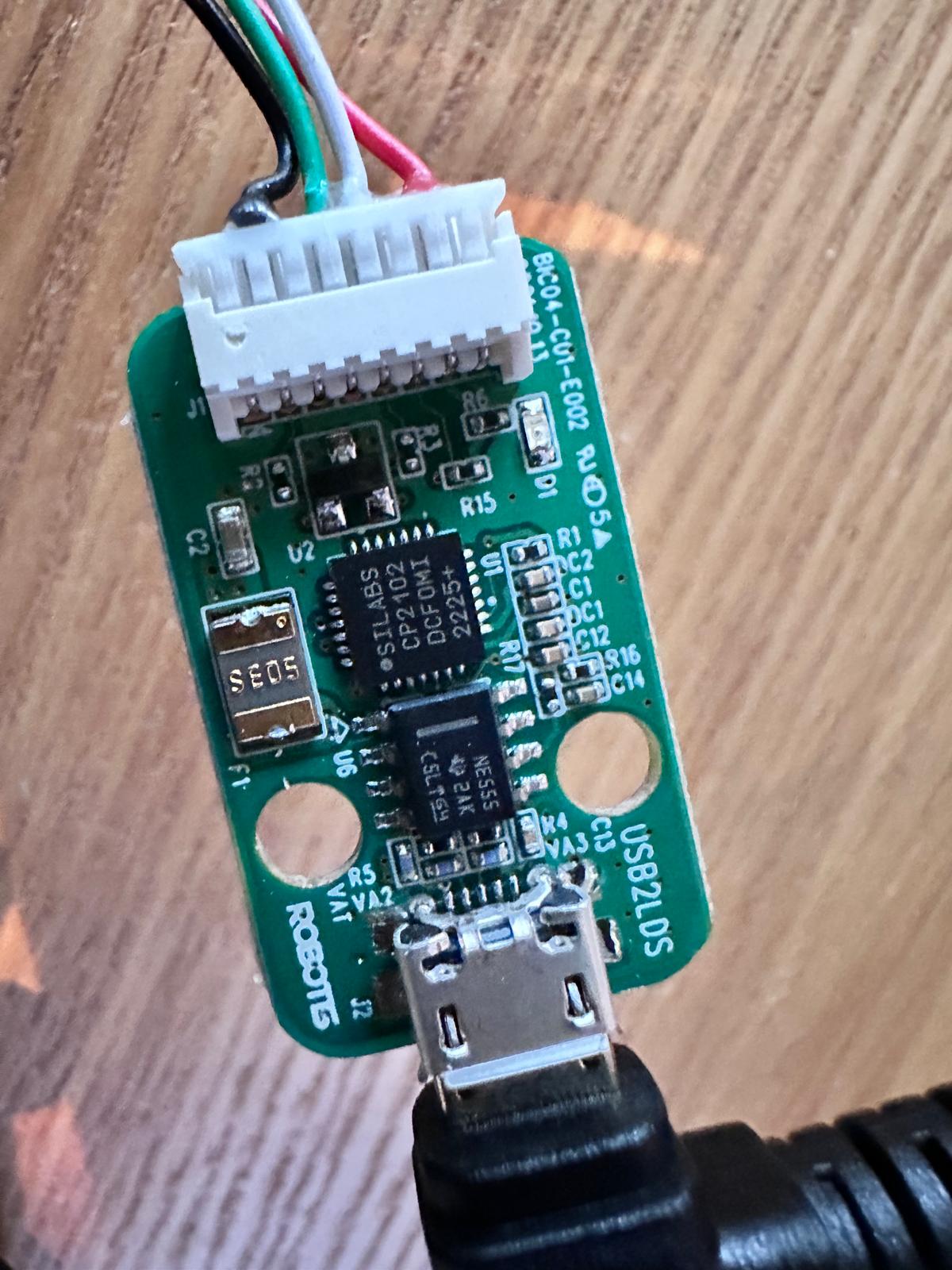 Het USB2LDS-bordje — een kleine ROBOTIS PCB met een Silicon Labs CP2102 USB-UART bridge — vormt de interface tussen LiDAR en Pi. Micro-USB naar de Pi, JST-connector naar de LiDAR. Geen draaiend motortje om op te wachten. Gewoon een blauw ledje en data op het /scan-topic.