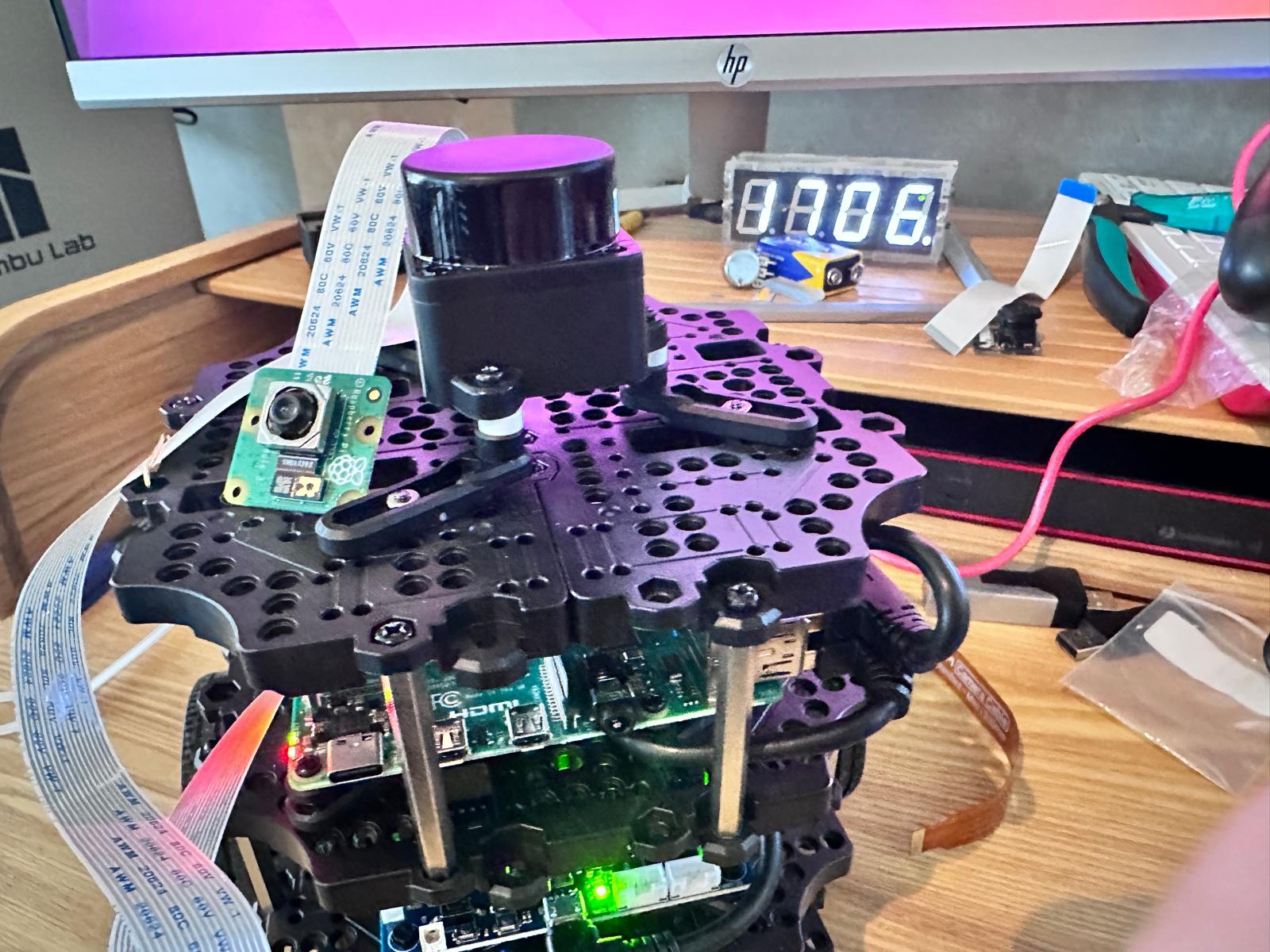 Onderaan zit het OpenCR 1.0-board. Dat is de motorcontroller die de Dynamixels aanstuurt en tegelijk als brug fungeert tussen de Raspberry Pi en de hardware. Daarboven de Raspberry Pi 4B met 4GB RAM — verbonden via USB met de OpenCR en de LiDAR.
