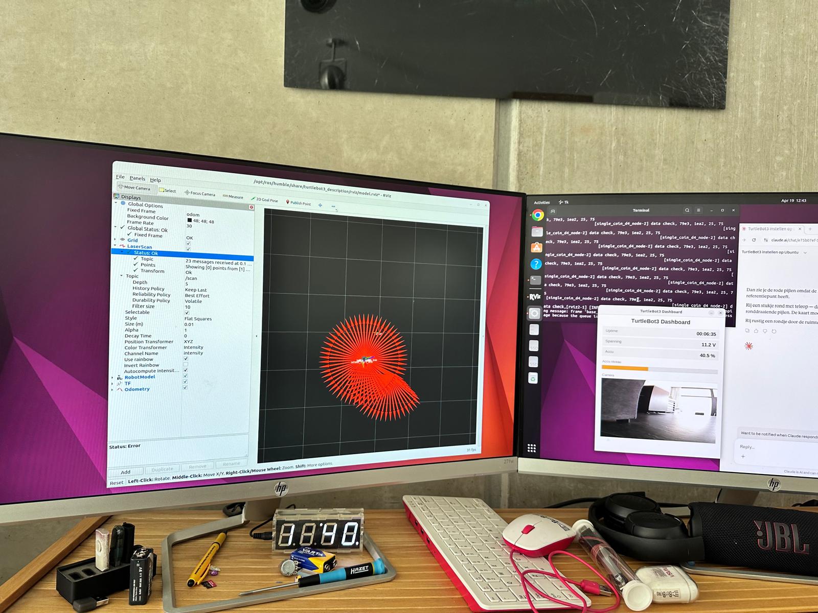 Op de T490s draait RViz2 — de LiDAR-scan als rode puntenwolk rondom de robotrepresentatie. Naast RViz2 een zelfgebouwd Tkinter dashboard in Python: live camerastream van de USB-webcam, accuspanning op één decimaal, accupercentage met kleurgecodeerde balk, en een uptime-teller. Alles via ROS2-topics.