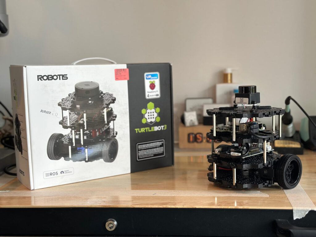 De doos staat op de werkbank. ROBOTIS-logo, ROS-badge, Burger in grote letters. Tien minuten later liggen alle onderdelen uitgestald en begint de opbouw. Doel: een volledig werkend ROS2-platform dat ik kan inzetten voor workshops, demonstraties en onderzoek in autonome navigatie.