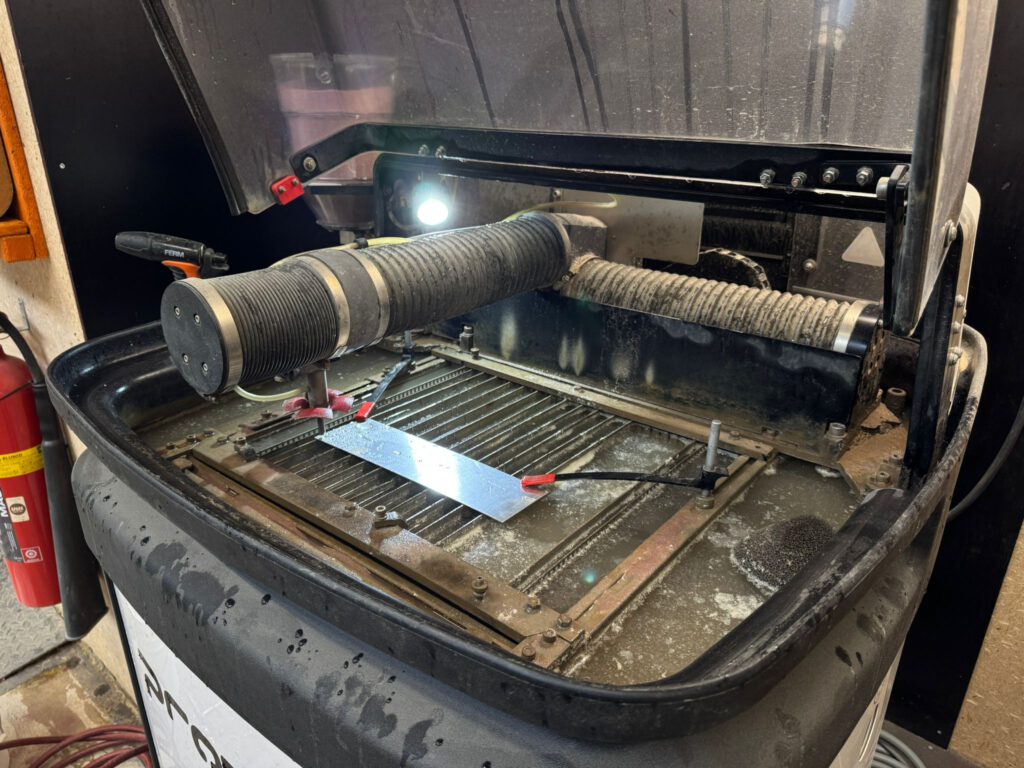 Om een goed beeld te krijgen van de situatie kijk ik bij, achter en in de machines. In het productieproces zie ik duidelijk waar de lineaire beweging plaatsvindt en waar ik kansen zie om die beweging meetbaar te maken. De kleinste slag die ik zie is ongeveer 2 cm, de grootste zo’n 30 cm. De snelheid en dynamiek varieert per opdracht. Verder valt me op dat er sprake is van wisselende lichtinval, metaaldeeltjes, olie, vet en fijnstof in de omgeving, én dat het geluidsniveau sterk fluctueert.