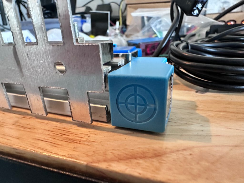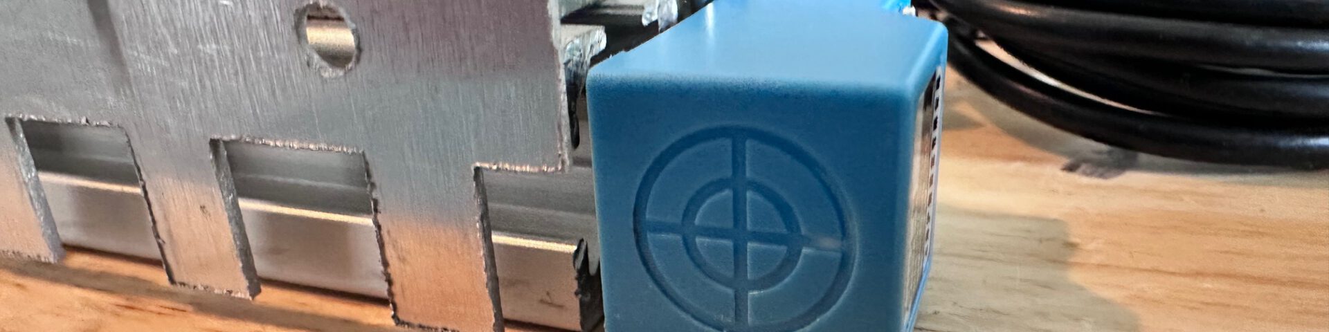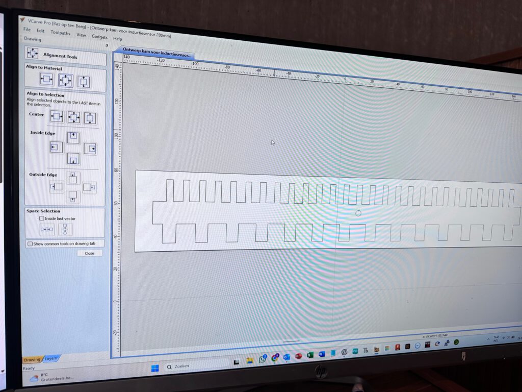 Na het tekenen van de triggerkam exporteer ik het model en laat het met een watersnijder uitsnijden in aluminium. Dit materiaal is licht, roest niet en weegt minder dan 10 gram, waardoor montage geen invloed heeft op het productieproces. De kam monteer ik op het schuifblok, de rail op een 2020-profiel, en aan het uiteinde plaats ik de inductieve sensor. Na aansluiting stel ik de sensor zo af dat iedere tandbeweging direct wordt geregistreerd.