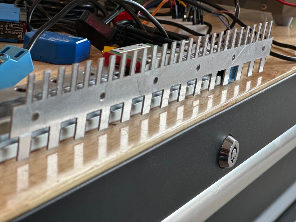 Om de sensor in een gecontroleerde omgeving te kunnen testen, bouw ik een test-rig (testopstelling). Hiervoor gebruik ik een kleine lineaire geleiderail met een schuifblok, vergelijkbaar met wat ik in de machines aantrof. Omdat er geen absoluut eindpunt is, ontwerp ik een triggerkam: een aluminium strip met tanden die over een lange lengte beweging simuleert. Ik maak twee typen tanden — 5 mm en 10 mm — zodat ik bewegingen vanaf circa 2,5 mm kan detecteren.