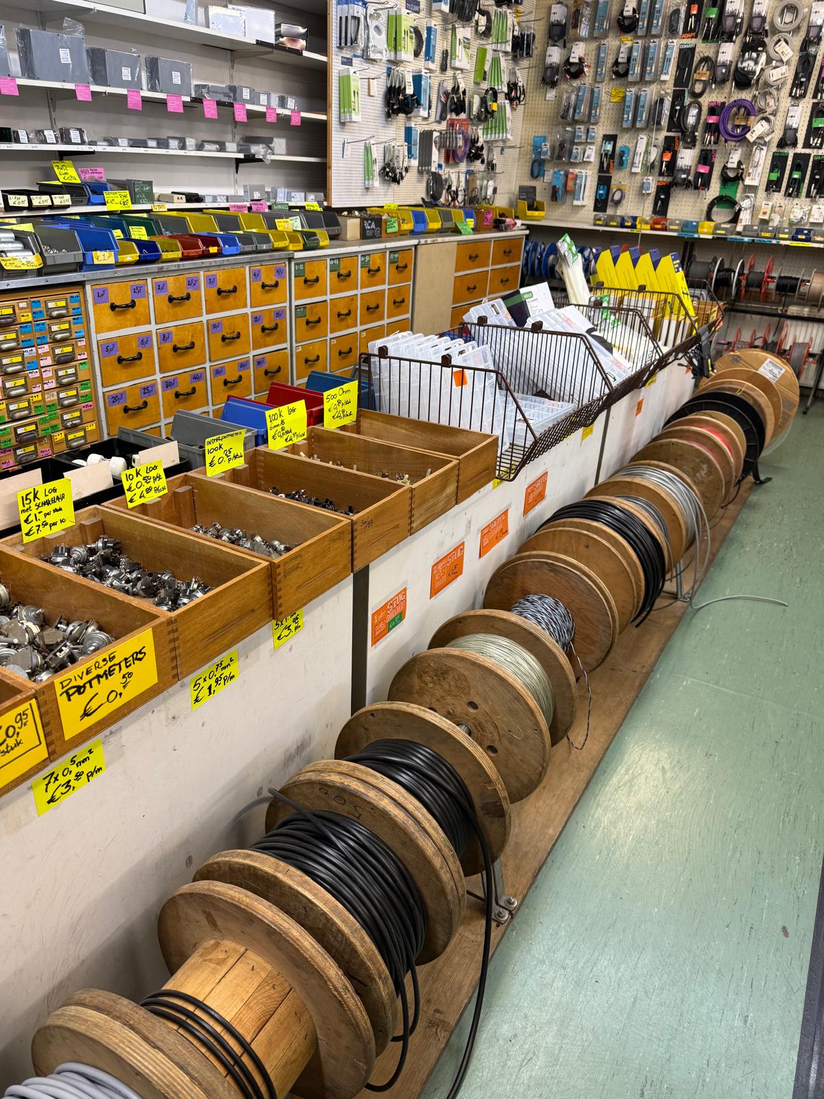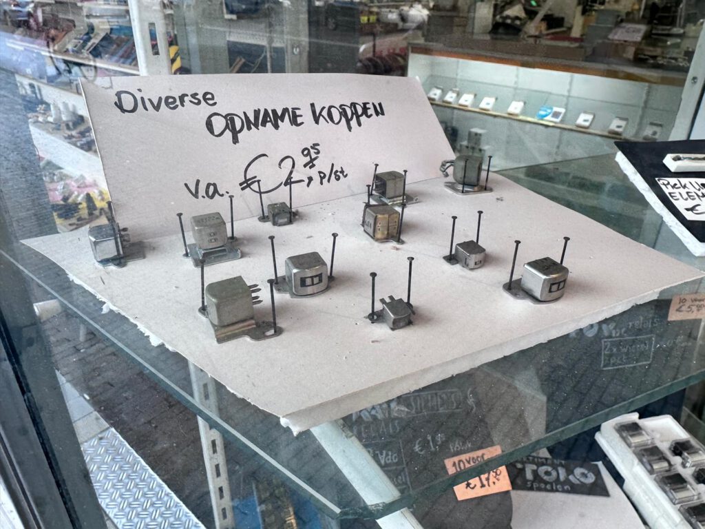 Wat me opvalt is de duidelijke indeling: componenten in goed gedocumenteerde lade-kastjes, gereedschap, fittingen, speakers, 230V-stekkers en behuizingen op overzichtelijke panelen. Draad op haspels, connectors gegroepeerd naar toepassing. De balie met glazen panelen — zichtbaar doorleefd door jaren van componenten uitzoeken — en vitrines met onderdelen en gereedschappen. En dan een onverwachte vondst: diverse opnamekoppen voor bandrecorders en cassetedecks.