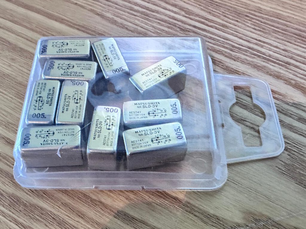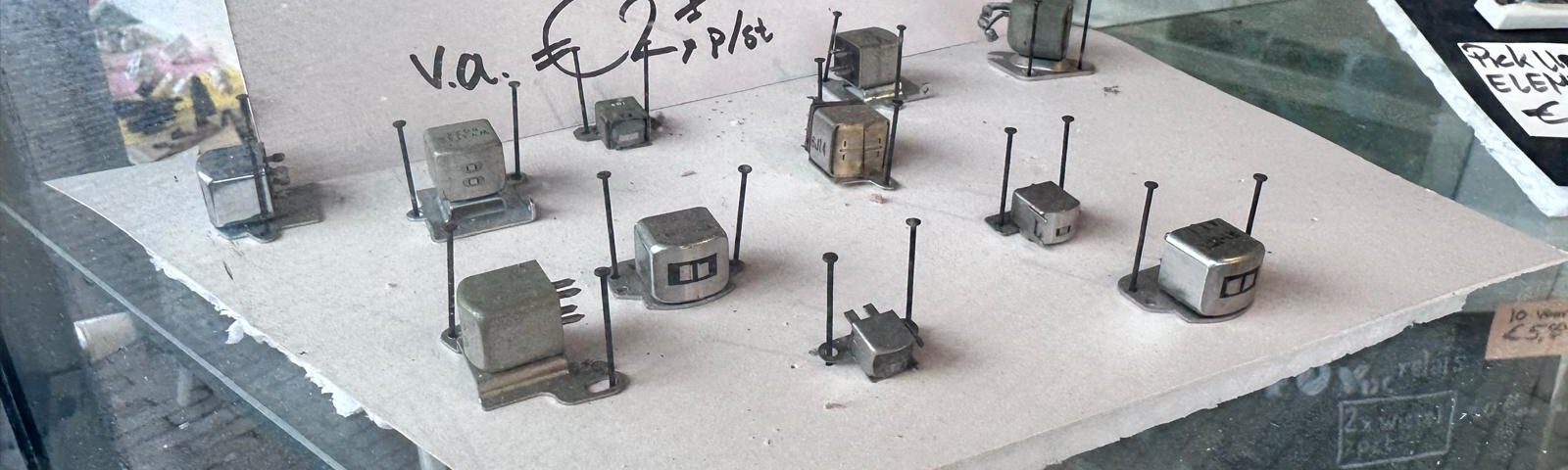 Dit soort winkels levert me vrijwel altijd inspiratie op. Ook nu ga ik niet met lege handen naar huis: ik koop een setje van tien polaire 3V Matsushita-relais (nu Panasonic). Deze relais onthouden hun laatste schakeltoestand, zelfs zonder spanning. Ze zijn compact (20×10×10,5 mm), schakelen met minder dan 5 mA en werken al bij 3 V. Ideaal om aan te sturen met een ESP32 of Raspberry Pi Pico — perfect voor low-power, off-the-grid toepassingen op batterij of accu.