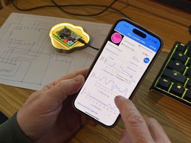 Dit roept direct praktische vragen op: hoe detecteer je menselijke aanwezigheid achter een glazen structuur? Glas breekt licht en weerkaatst geluid, waardoor optische en ultrasone sensoren afvallen. Wat logisch overblijft is electro-magnetische radar. Een LD2410C-radarsensor detecteert met microgolven beweging en aanwezigheid, werkt onafhankelijk van licht en geluid en functioneert zelfs betrouwbaar door dunne materialen heen.