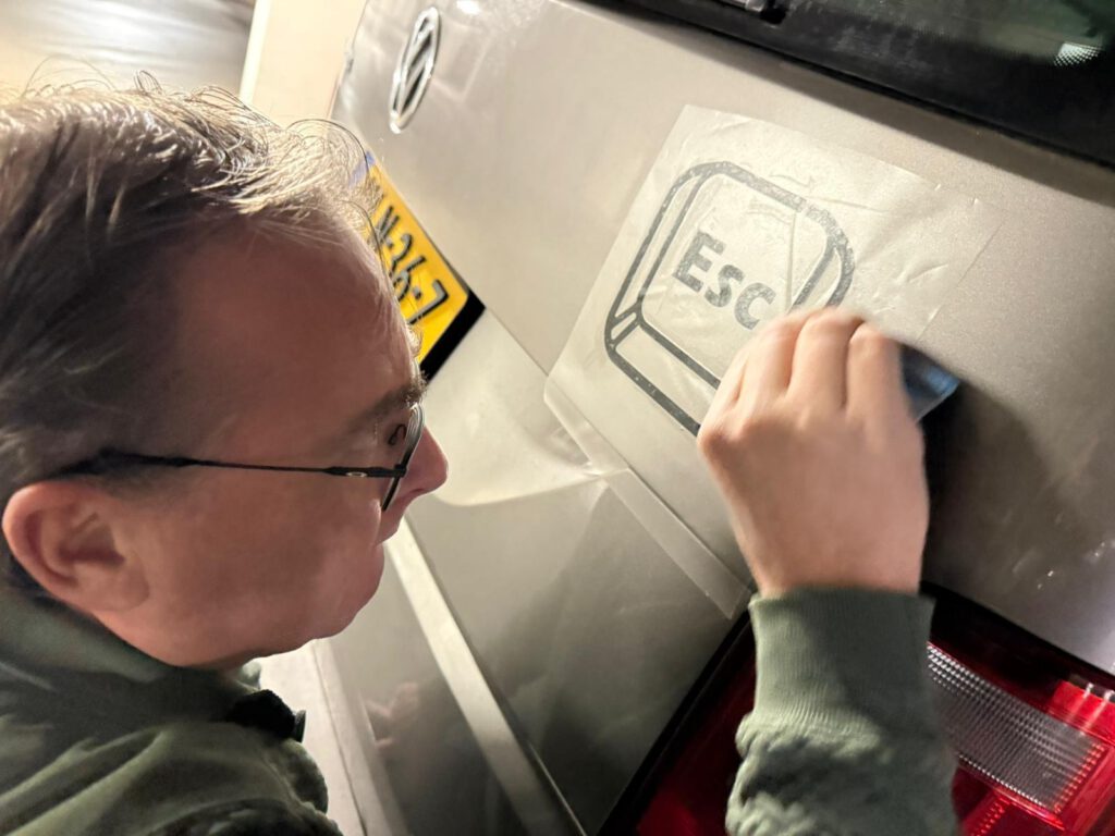 De sticker positioneer ik zorgvuldig, breng hem rustig aan en geef overal gelijkmatige druk. Daarna trek ik de transferfolie weg. Het ontwerp blijft strak achter op de klep. Klaar. Een kleine ingreep, maar met karakter. De camper heeft nu niet alleen een naam, maar ook een verhaal dat begint bij één simpele toets: Esc.