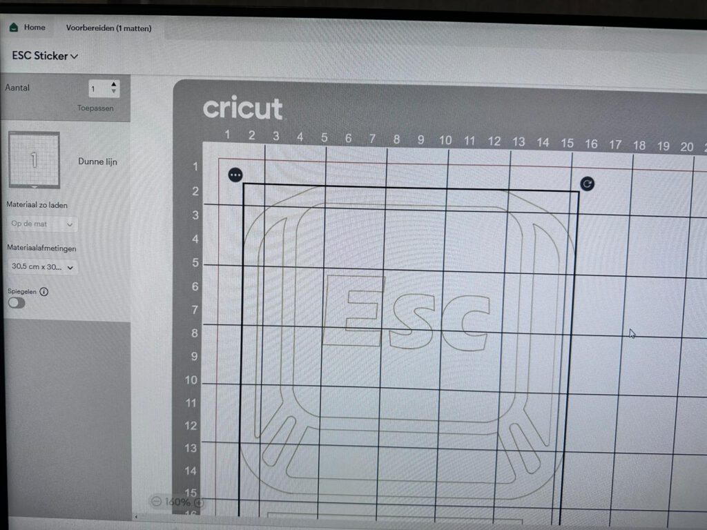 In Cricut Design Space lees ik het DXF-bestand in en schaal de sticker naar 15 cm hoogte. Groot genoeg om zichtbaar te zijn, subtiel genoeg om niet te overheersen. Het vinyl wordt op de snijmat geplakt zodat het vlak blijft. Daarna snijdt de plotter het ontwerp met een roterend mes, precies langs de vectorlijnen.