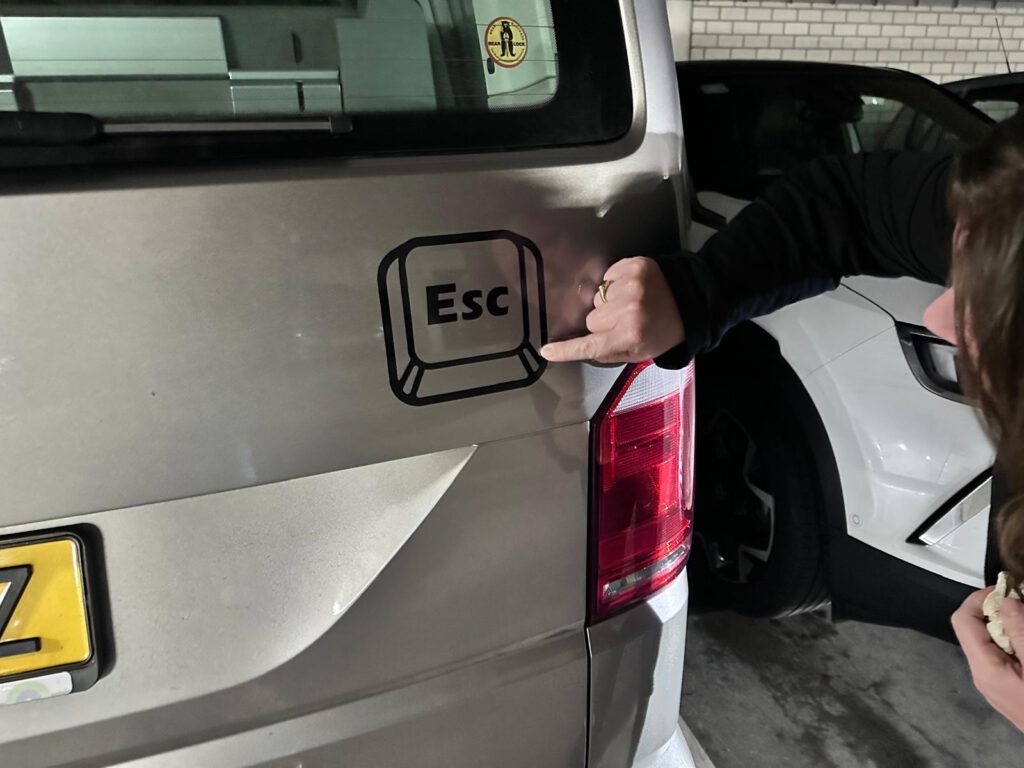 Een camper een naam geven maakt ’m persoonlijk. Het voelt minder als een voertuig en meer als een reisgenoot met karakter. Elke reis krijgt zo z’n eigen verhaal. Met een sticker laat je dat ook zien aan de buitenwereld: dit is óns huisje op wielen — herkenbaar, trots en een tikkie eigenwijs. Vandaag krijgt onze camper daarom een visuele handtekening in de vorm van een Esc-toets.