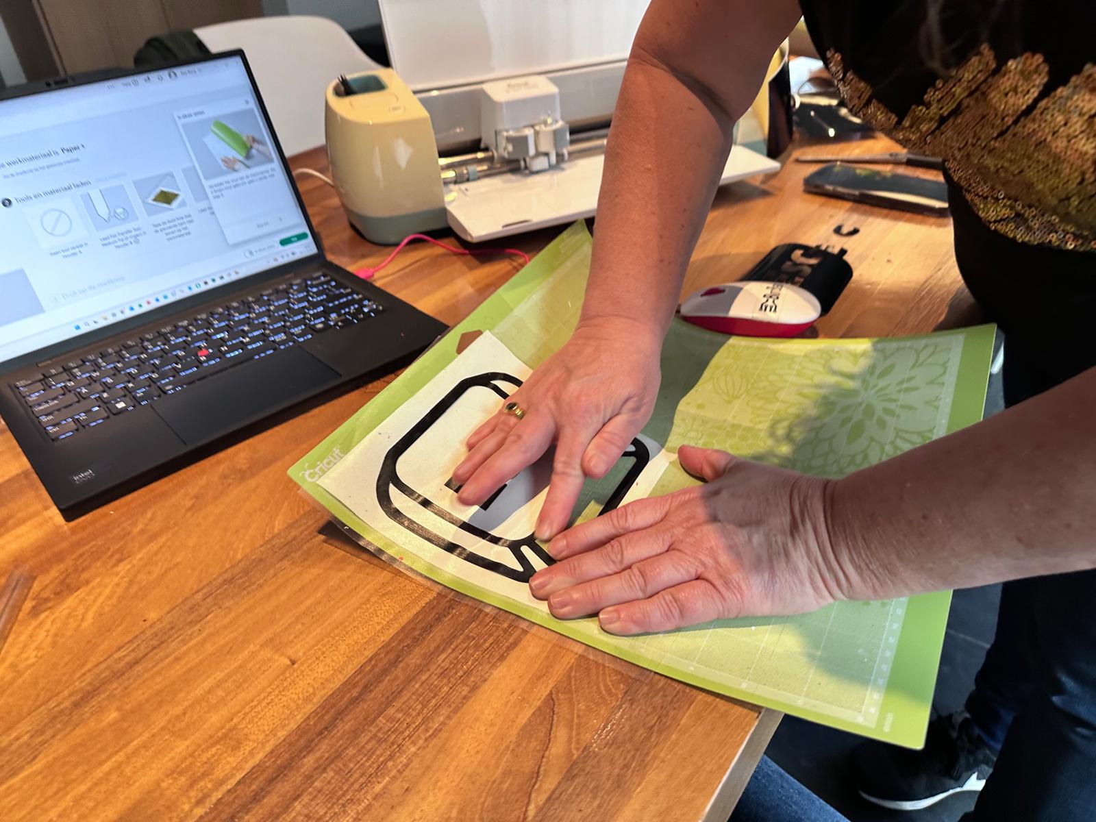In Cricut Design Space lees ik het DXF-bestand in en schaal de sticker naar 15 cm hoogte. Groot genoeg om zichtbaar te zijn, subtiel genoeg om niet te overheersen. Het vinyl wordt op de snijmat geplakt zodat het vlak blijft. Daarna snijdt de plotter het ontwerp met een roterend mes, precies langs de vectorlijnen.
